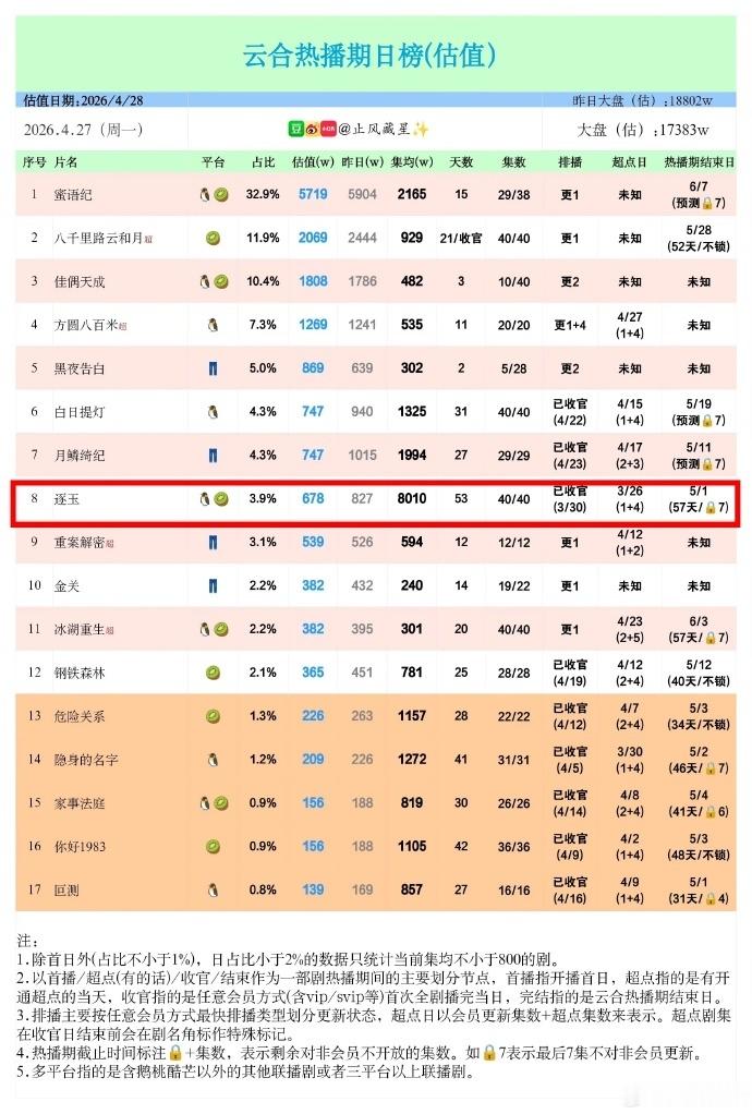 里程碑!逐玉成为云合改版以来总榜第九,也是第一部正式迈入8000俱乐部的女频剧,历史性突破 逐玉热播期云合成绩