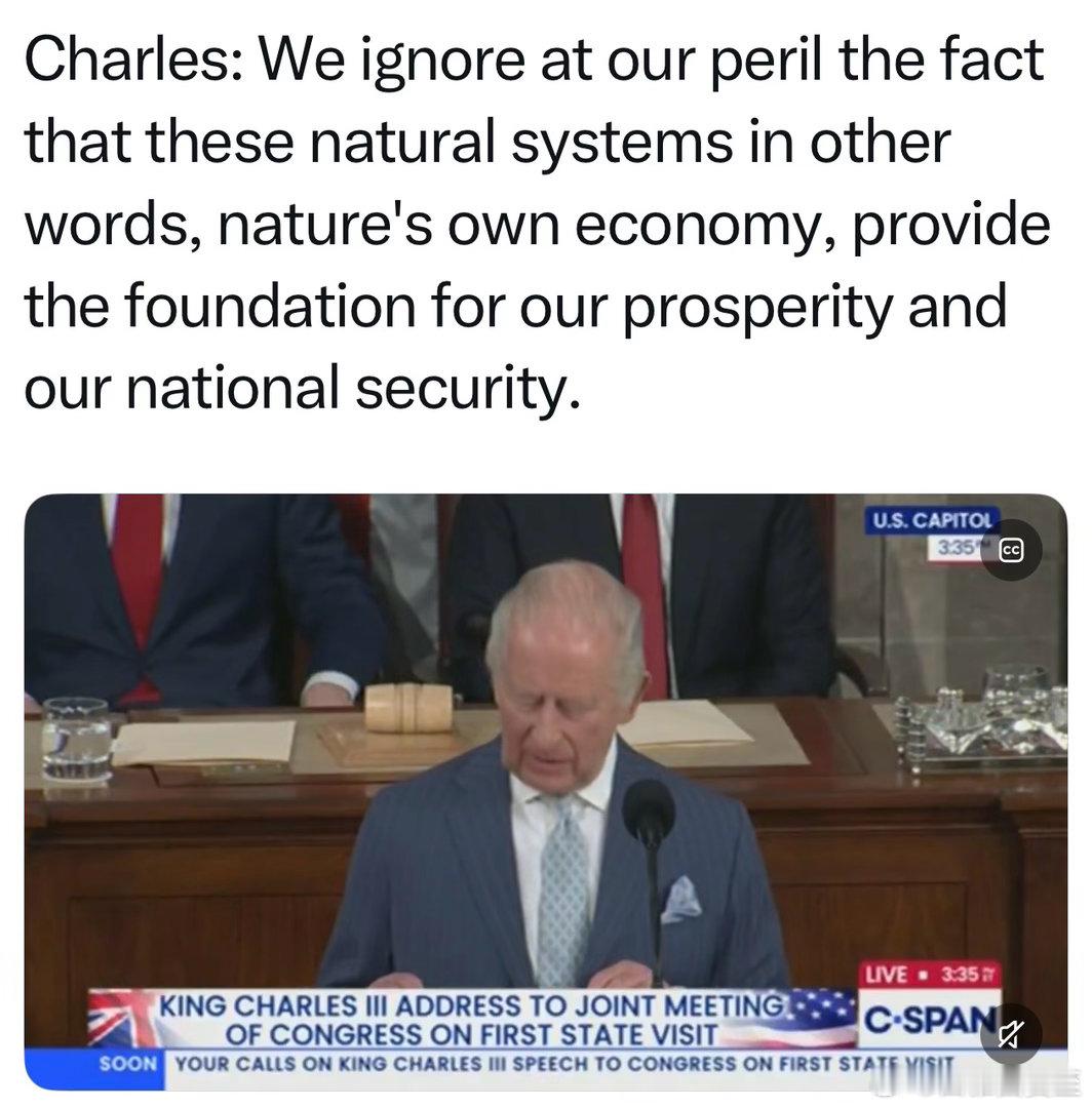 🌍英王还提到了他非常关心的环保问题,称“大自然是经济繁荣和国家安全的基础”