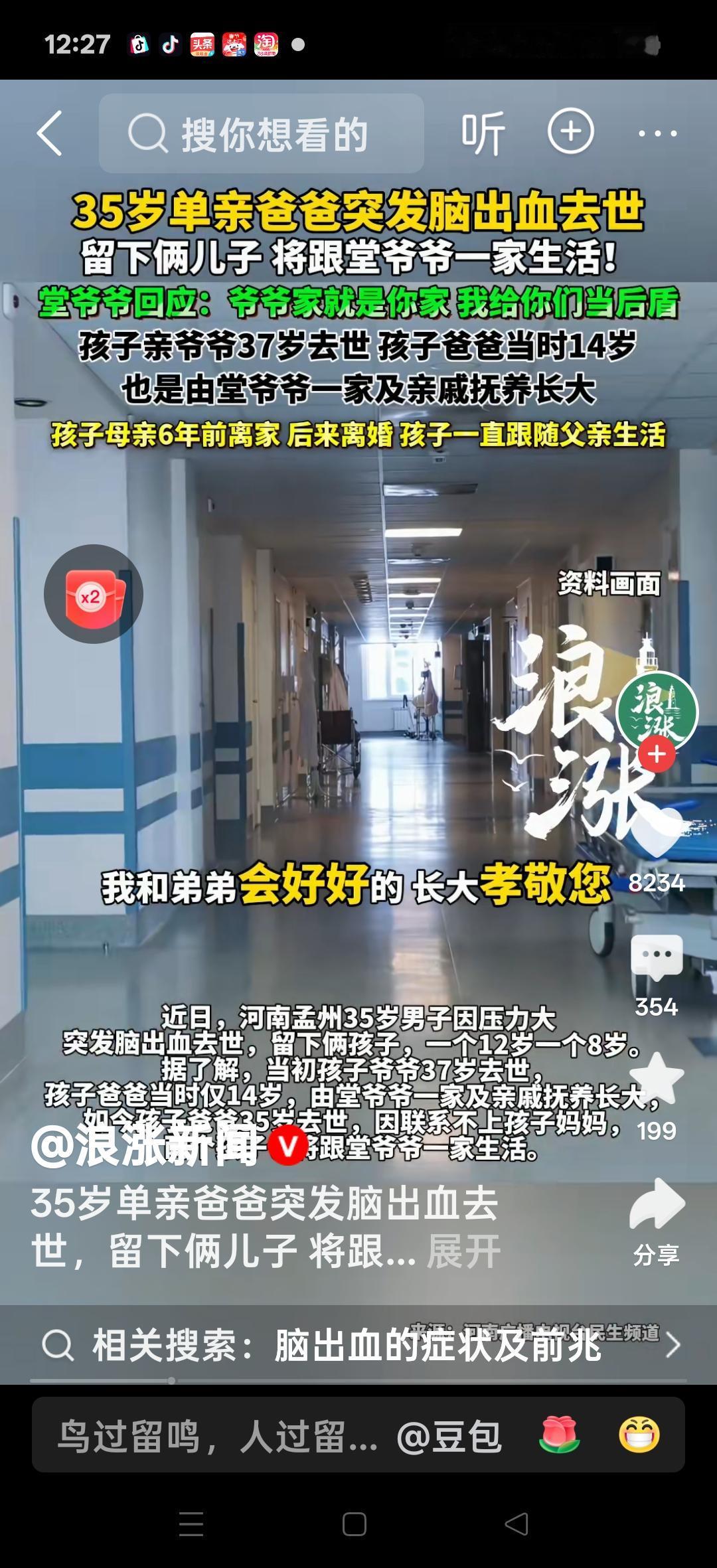 35岁单亲爸爸突发脑溢血去世,留下两个儿子将跟堂爷爷一起生活。孩子亲爷爷37岁去世,爸爸当时14岁,是有堂爷爷和一家亲戚将他养大,母亲六年前和他父亲离婚。网友说:堂爷爷可能是我们这里的二爷爷,三爷爷,与自己的爷爷是亲兄弟。这个堂爷爷是积德行善之人,他会高寿,福泽后代的。更希望孩子的妈妈看到这个视频,有点良知!把自己亲生的孩子抚养长大。虽然有堂爷爷在,还是觉得俩孩子怪可怜的!有的人说:最好带孩子做个基因检测,这是不是家族遗传病?有条件的话做好提前预防。以后两个孩子会有出息的,堂爷爷来享福!大家说是这样的吗?