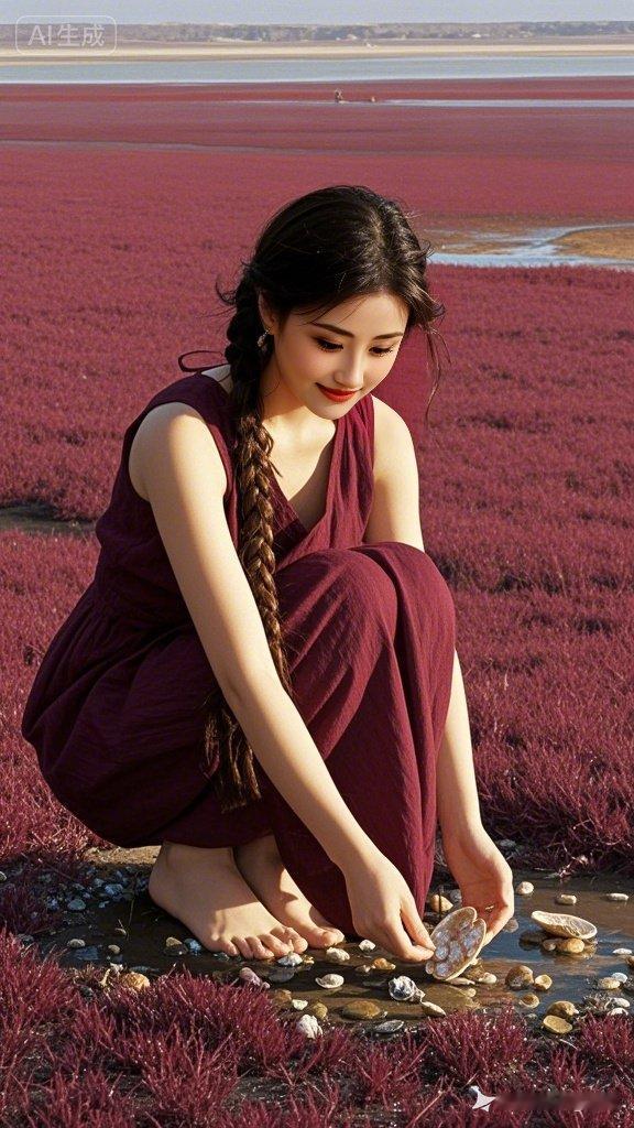夜幕之下,女子垂落粗长棕调麻花辫。身着勃艮第红无袖长裙,赤脚蹲于红海滩捡拾贝壳,