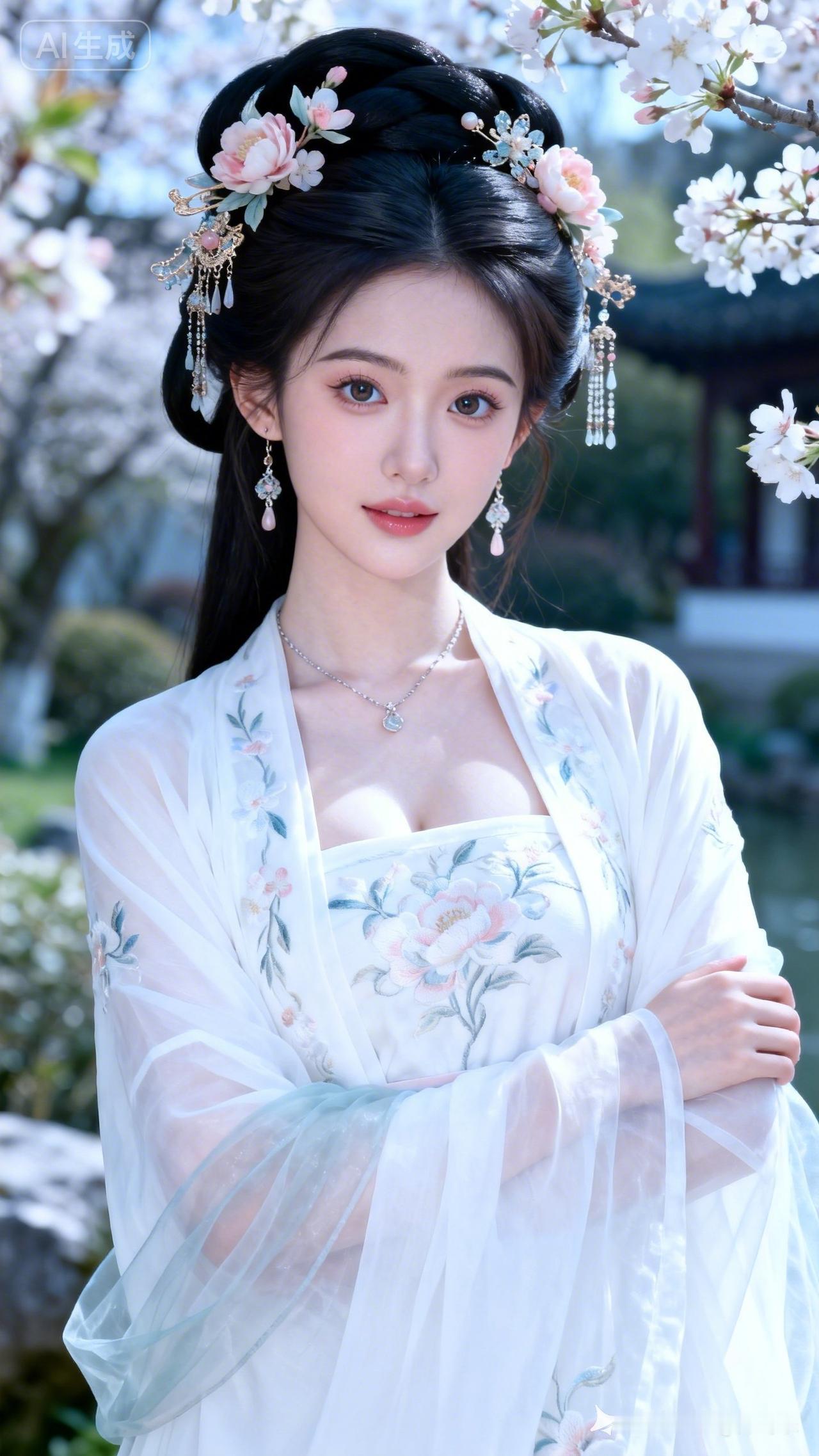 古风绝色美人宛若春日画中仙,桃花眼配远山眉,雪肌冷白皮。华丽步摇盘发配绢花首饰,白绣绫罗纱衣挽轻纱,静立园林花前,清雅温柔,超清古风人像摄影。