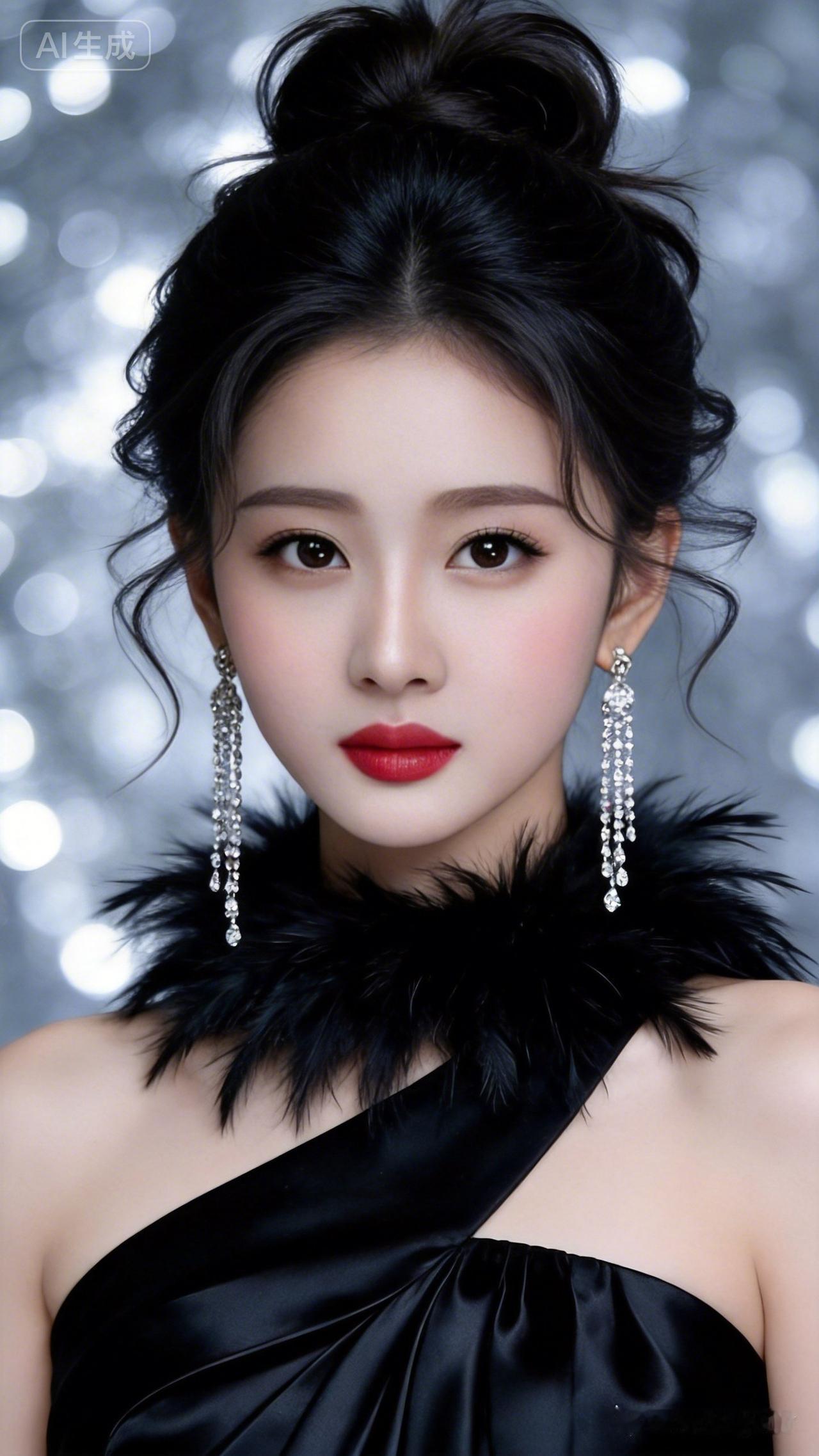 银灰朦胧光斑背景,蓬松高髻搭配慵懒碎发。柔粉腮红衬冷白肌肤,正红哑光唇精致明艳,银钻长款耳坠灵动摇曳。黑色单肩羽毛缎面礼服,冷调光影交织,尽显清冷华贵优雅气质。