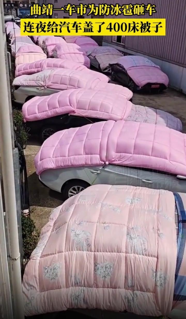 曲靖做汽车经销的老板也太用心了!最近强对流天气扎堆,冰雹说落就落,为了护着露天的展车、试驾车,全都给车子盖上了厚厚的棉被。远远望去一排排车裹着棉被,画风超有趣,还以为是集体晒被子呢,盖的时候还用绳子扎牢了,这样就不会被大风刮跑了。