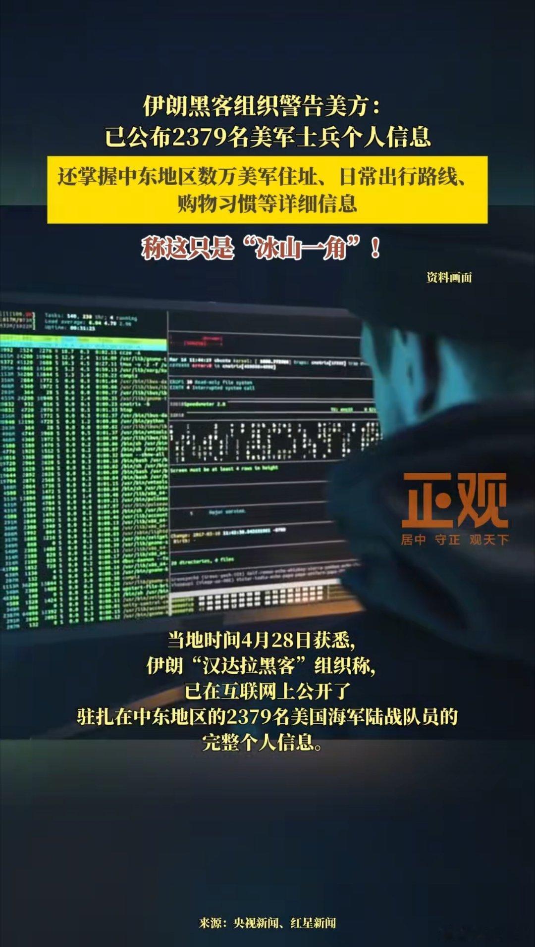 伊朗黑客“开盒”美军,霸权安全神话破灭4月28日,伊朗“汉达拉黑客”组织曝光2379名驻中东美军陆战队士兵完整信息,含住址、出行轨迹与消费习惯,称此举只是监控能力的冰山一角,更是对美方的严厉警告 。长期在中东耀武扬威的美军,所谓绝对安全实则不堪一击。黑客放话侵略者将遭导弹无人机打击,直指美国中东霸权。这记重拳戳破美军安全幻觉,也昭示网络时代霸权行径必遭精准反制,霸权逻辑注定碰壁。伊朗黑客公布中东美军2379人信息