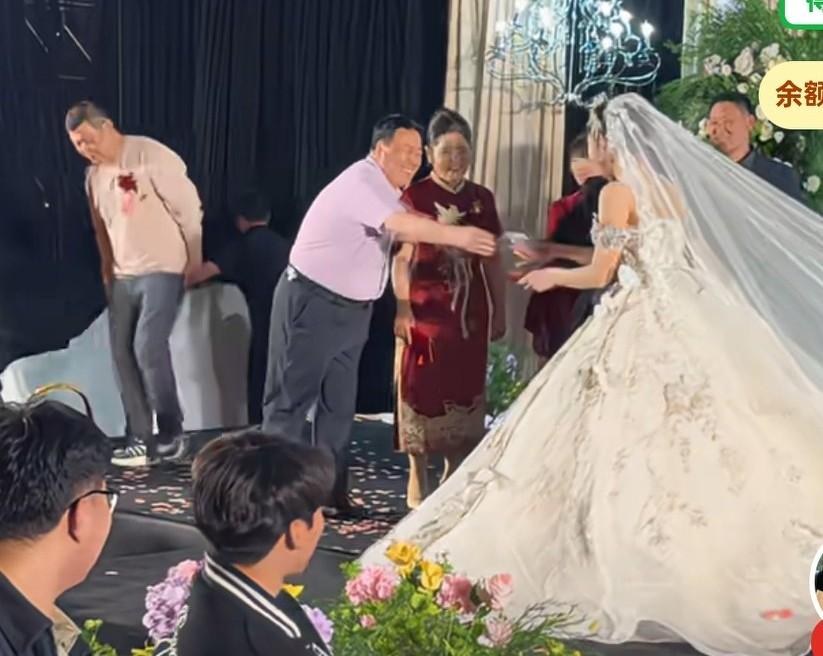 这个坦克啥意思,结婚仪式上,新娘喊一声爸, 喜公公答应的干干脆脆, 新娘喊了几声爸之后, 主持人说这爸不是白叫的, 赶紧掏钱, 喜公公从兜里掏出来了一沓子钱, 主持人问新娘还叫爸吗, 新娘说不叫了, 他没钱了, 主持人说再叫几声, 可能还会有惊喜呢, 新娘真的叫了几声爸, 这喜公公说抬上来, 这是你们小两口心心念念的坦克400, 于是几个人抬了一辆纸糊的坦克400, 并且还把钥匙给了新娘子。 网友说,这到底是结婚呀, 还是交易呀, 不过这纸糊的坦克车真的适合婚礼上用吗, 感觉这样有点诡异,不吉利。