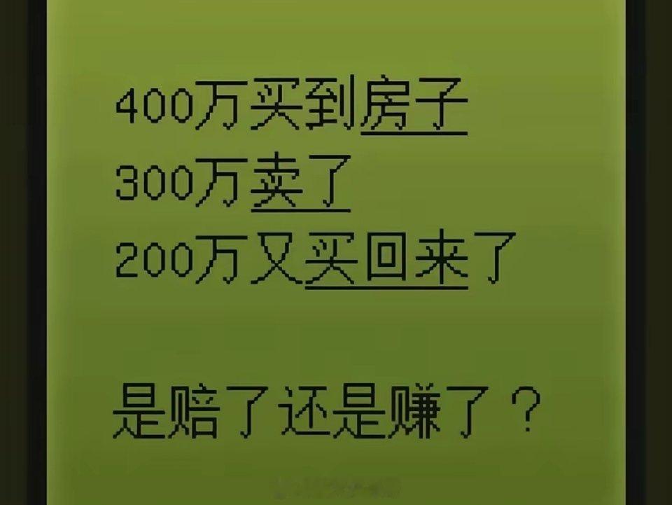 看看你是不是块投资的料。请问:400万买到房,300万卖了,200万又买回来了。是赔了还是赚了,赔了多少or赚了多少?