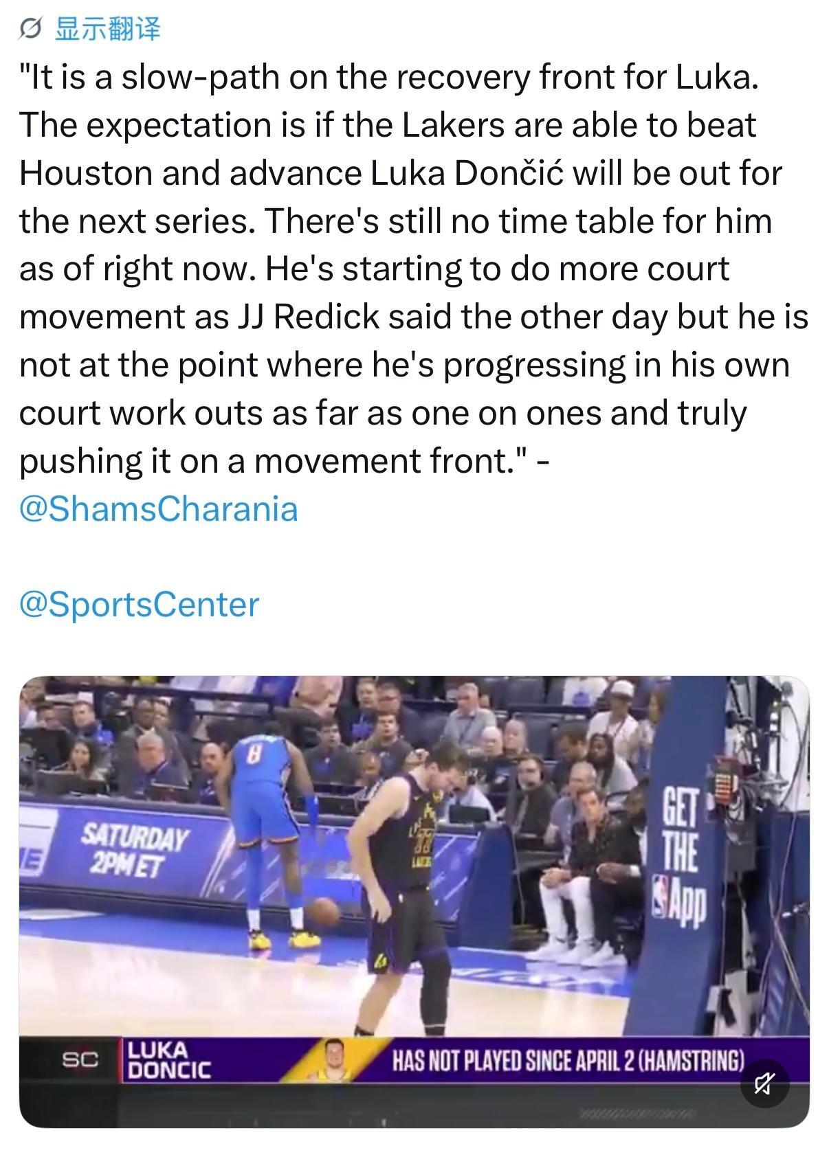 Shams:卢卡的康复进程十分缓慢。目前的预期是,即便湖人能够击败火箭晋级,东契奇也将缺席下一轮系列赛。截至目前,他的复出时间表仍未确定。正如雷迪克日前所说,他已经开始进行更多的场上移动训练,但他还没有到可以推进个人训练的阶段——比如一对一对抗,也远未达到在移动中全力发力的程度。