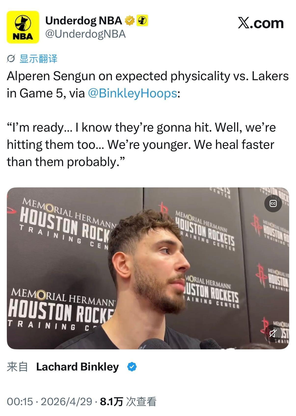 “我已经准备好了!我知道他们会打得很有对抗性,身体接触会很多,不过,我们也会跟他们硬碰硬的。我们更年轻,身体恢复速度也比他们更快。”