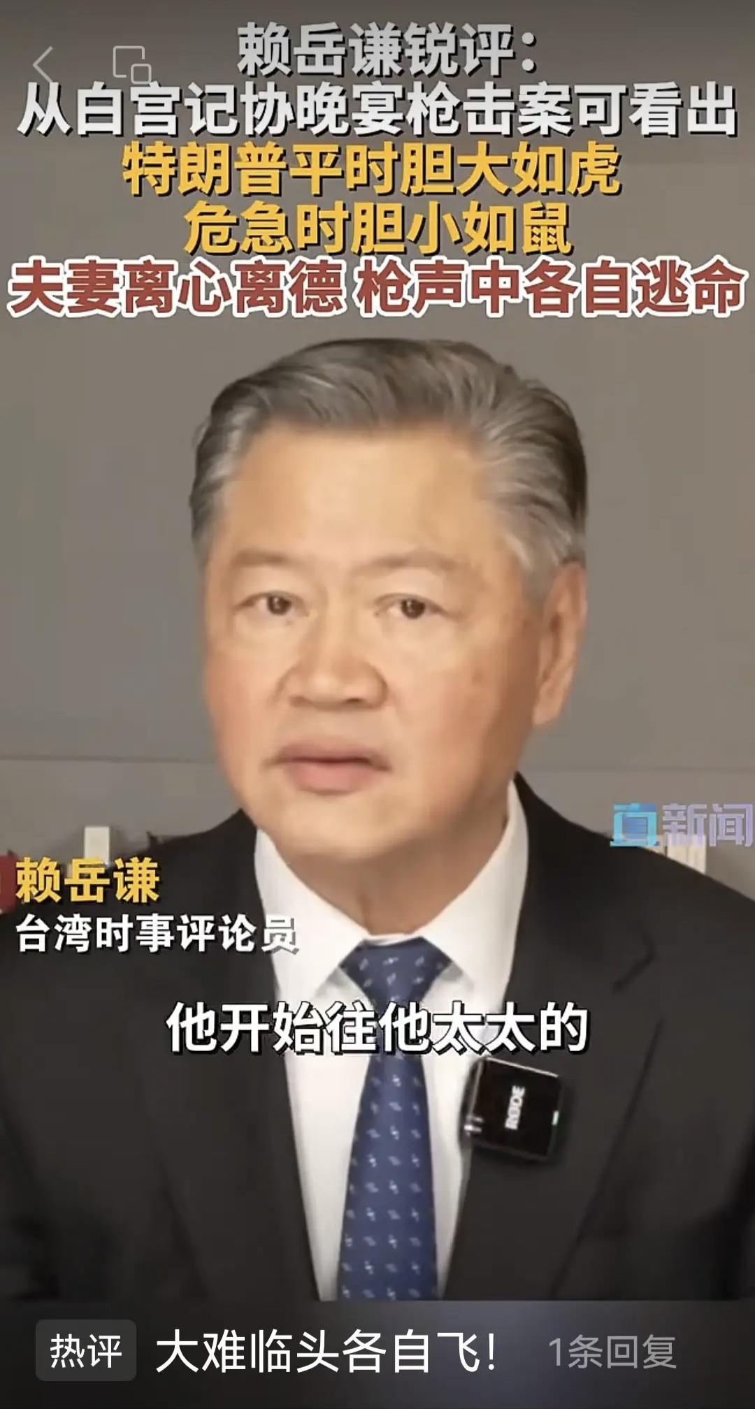 台湾赖岳谦教授的几句锐评,戳破了特朗普的硬汉伪装。白宫记协晚宴的枪声一响,平时喊打喊杀、胆大包天的特朗普,瞬间成了慌不择路的胆小鬼。 枪响瞬间,现场乱成一锅粥。特朗普起初还嘴硬说“以为是托盘掉地上”,转头就被拍到腿都软了,差点趴地上,踉跄着被特勤护着撤离。 更讽刺的是,他口中“躲避得更快”的梅拉尼娅,早就反应过来钻到桌下,夫妻俩全程没顾上彼此,在安保簇拥下各走各的路,真是大难临头各自飞。 平日里,特朗普总把自己包装成无所畏惧的领袖,推特上怼天怼地,演讲里喊打喊杀。可枪声一响,他连基本的镇定都装不出来,几乎是被吓傻了,连特勤都得催着他撤离。反观梅拉尼娅,反应比他快得多,早早就躲好了,夫妻离心离德的场面,被镜头拍得明明白白。 赖岳谦说得一点没错:特朗普就是典型的“平时胆大如虎,危急时胆小如鼠”。那些竞选造势里的硬汉人设,在真正的危险面前不堪一击。所谓的“夫妻同心”,在枪响的那一刻就碎得稀碎。 这场枪击案,没伤到特朗普分毫,却把他的真实面目扒得一干二净。平时的嚣张气焰,不过是建立在绝对安全的舞台上;真正面对死亡威胁时,他比谁都慌。 特朗普状态 特朗普怒斥美国 特朗普碰壁