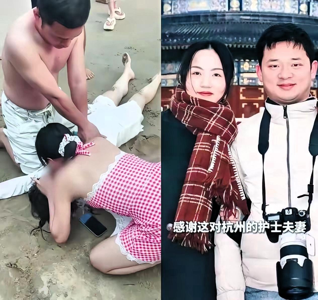 找到了!海南万宁沙滩上,为溺水女子做心脏复苏和人工呼吸的护师夫妻找到啦!这是一对90后医护夫妻,丈夫姜智文是浙大一院余杭院区急诊监护室主管护师,妻子袁苑在同院综合监护室担任护师。两人平时都在临床岗位认真工作,日常见惯了紧急救治,专业能力扎实,责任心也很强。 夫妻俩趁着休息时间,到海南万宁散心度假。本来是轻松的旅途,没想到偶然遇到意外状况,一名女游客溺水之后昏迷倒地,情况看起来很不好,嘴角还有白沫。现场围观的人不少,大家心里都很着急,但大多不懂专业急救,只能在一旁干着急。 看到情况紧急,两人没有多想,立刻上前帮忙。丈夫熟练开展心脏复苏按压,动作标准沉稳。妻子没有在意现场的状况,放下顾虑,及时为溺水女子做人工呼吸。两人配合默契,按照专业流程一步步施救,尽自己最大努力帮助对方脱离危险。 在医院里,他们是尽职尽责的医护人员。走出工作岗位,他们只是普通游客。但职业赋予的责任感,早已成为一种本能,遇到有人身处险境,就会毫不犹豫伸出援手。 没有轰轰烈烈的刻意表现,也不求任何回报,只是出于本心和职业素养,默默救人于危难。生活里这样平凡又善良的人,才是最难得的温暖。 这种遇事挺身而出、朴实善良的举动,值得我们所有人学习和称赞。