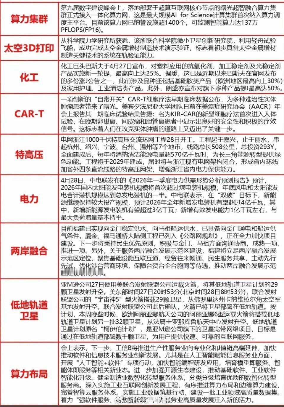 1.算力集群2.太空3D打印3.化工原料4.特高压,电力5.低轨卫星6.算力布局涨停汇今日看盘a股