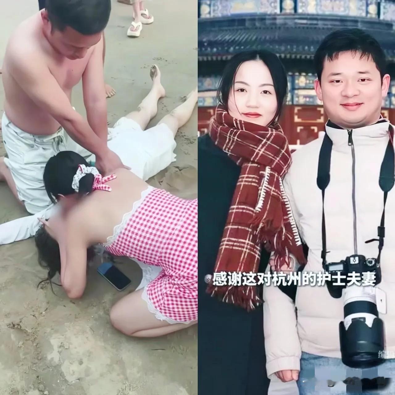 找到了!找到了!海南万宁沙滩上,为溺水女子做心脏复苏和人工呼吸的护师夫妻找到啦!丈夫是来自浙大一院余杭院区急诊监护室的主管护师姜智文,妻子是来自浙大一院余杭院区综合监护室的护师袁苑。 原本只是一场海边的浪漫日落,硬是上演了一出生死时速。 事情发生在4月26日傍晚,夫妻俩本想趁着假期在海南万宁的沙滩上追一场日落,结果夕阳没看成,先看到一群人抬着一个浑身湿透的女人从海里冲上来。 这口气差点就没上来。被救上岸的溺水女子脸色青紫,口吐白沫,人已经没了心跳。作为急诊监护室里的“老手”,姜智文和妻子袁苑甚至没有经过商量,身体比脑子反应还快,直接冲进了人群。 求生和职业的本能让他们直接跪了下去。 这里有个细节特别让人破防。姜智文双膝砸在粗粝的沙地上,手一搭上脖子就知道颈动脉没了搏动,立刻开始心脏按压。而妻子袁苑更不是一般人,面对不断从溺水者口中涌出的带着海水的白色泡沫,在没有纱布、没有任何防护的情况下,她托起下颌,捏住鼻子吸了口气,就口对口吹了下去。说实话,这种混合着呕吐物和未知感染风险的口腔清理,在这种危急时刻显得极为重要,稍有差池,人就算救回来也会因为气道堵塞留下不可逆的脑损伤。 时间被定格在了18点07分到18点11分。这4分钟,对于我们普通人来说可能只是刷个短视频的功夫,但对于心脏骤停的人来说,是生与死的距离。医学上有很残忍的数据,心脏骤停超过4分钟,大脑就会开始不可逆的损伤,哪怕活过来,也可能变成植物人。在生死的悬崖边上,这对医护夫妻硬生生把人往回拽了最关键的一步。 要说专业,这对夫妻真的是把监护室搬到了沙滩上。大家如果在网上看过视频就会觉得很“稳”。人救回来之后,两人并没有急于站起身接受欢呼,而是继续跪在沙滩上。袁苑这时候掏出了手机,不是要拍照发朋友圈,而是打开手电筒检查溺水女子的瞳孔对光反射,盯着时间评估生命体征。这看似微小的动作,其实是在观察颅内和高级神经中枢的损伤情况。 姜智文则守在旁边,持续拍打着患者的肩膀,嘴里不断地大声呼叫,试图把她的意识喊回来。在他心里,这口气虽然喘上来了,但生命依然像风中的烛火,说灭就灭。旁边有个年轻小伙子吓得脸都白了,蹲在地上满脸无助,但夫妻俩的世界里只有病人的那根颈动脉和每一次微弱的呼吸。 等到120急救人员扛着担架赶到,完成了平稳转运后,夫妻俩这才发现自己的膝盖已经被沙子和碎石磨破了皮,血丝和细沙嵌在肉里,后知后觉传来一阵阵钻心的疼。 这场堪称“教科书级别”的急救,火得理所当然,也火得让人心头一暖。但很多时候,英雄往往就在人群里,救人时爆发出的惊人默契,源于日复一日在病房里的打磨。姜智文在监护室里待了整整11年,妻子袁苑也有着5年的重症护理经验。对他们来说,这种“混双式”的抢救早就是刻进骨子里的肌肉记忆。什么情况该按压,什么情况该除颤,两人一个眼神就秒懂一切。这并不是什么惊天动地的巧合,而是厚积薄发的必然。 在这起事件中,我们更应该看到“接力”的力量。如果不是当地村民崔经络等四人没有丝毫犹豫,第一时间跳进海里把女子托举上岸,恐怕也没有后面这“4分钟”的奇迹了。从普通人到专业人士的精准衔接,正是这个社会最稀缺的善意链条。 这件事也像是一面镜子。我们总以为猝死、溺水这些意外离生活很远,但明天和意外真的不知道哪一个会先来。在公共场所,掌握心肺复苏技能的普通人太少了。很多时候,围观的人除了焦急等待救护车,就只剩下苍白的祈祷。其实,如果我们能稍微懂一点急救常识,或许就能成为别人的救命稻草。这世间,能救人于水火的,并不一定非要是超级英雄,但一定得是有勇有谋、懂得科学急救的人。 如今,那个溺水的女游客已经苏醒,这无疑是命运给予的温柔回应。她是不幸中的万幸,在差点被死神带走的那一刻,恰好遇到了一对休假的白衣夫妻。 这也是为什么这个新闻哪怕看着很朴实,却依然能刷爆全网的原因。我们从中看到的不止是一次成功的施救,更是不分场合、不分休不休假的那种刻在骨子里的慈悲与本色。本来想追海边日落,却等来一场生死考验,正如姜智文说的那句轻描淡写的话,也挺值的。 这场夕阳,是救人一命后心里的那片光亮。 各位读者们对这件事怎么看?请在评论区留言。