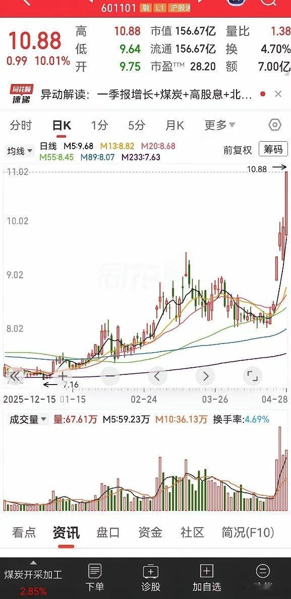 看看这样的股票,明显就是简单粗暴。有资金持续流入,股价就能上涨。如果没有资金流入,神仙都涨不起来。基本面也没有什么太好说的,是做煤炭的,同时也会做一点煤化工甲醇一类的。还有一点挺不错的,就是股息率还不错,2.7%,分红比例高达70%。在现在这个市场中算是很不错的了。可以很明显地看出,涨停之后,虽然抛压也很重,想出逃的筹码也不少,但是有资金在做承接。就像拔河一样的,看买入的更多还是卖出的更多,他们势均力敌的时候,所以股价也不涨不跌。如果买方的资金大于想出逃的筹码,那么股价自然上涨。其实昨天也还算是一个不错的买入点,震荡了一整天还是把价格稳住了,不像那种断板之后价格稳不住,直接往下杀,其实今天开盘的时候承接的也还算不错。