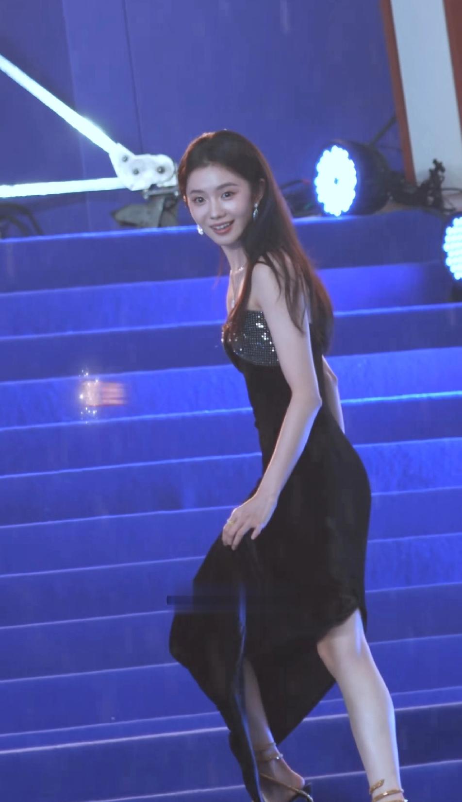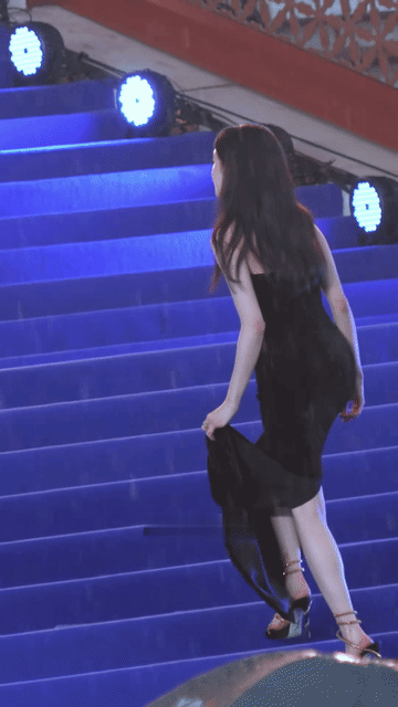 刘浩存镜头前美的像仙女,转回头就楚楚可怜的拧裙摆的水,这对比有点搞笑,不过说真的,美女不管什么情况下都很有氛围感,都是美美的,礼服被雨淋湿了,本来是很狼狈的事,可刘浩存拧裙摆时的姿态却美的像一幅画,窈窕的背影,纤细柔软的腰肢,一切看起来都那么美好!