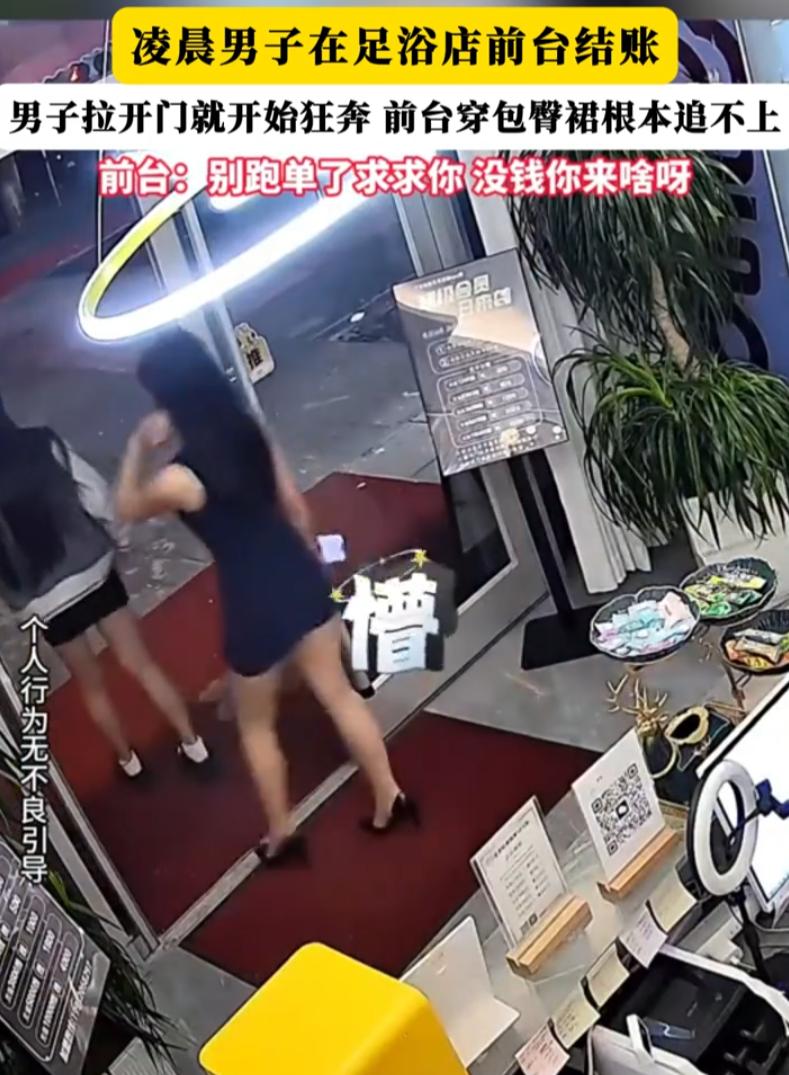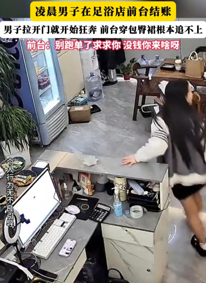 “没钱就别去!”浙江杭州,一男子凌晨去足浴店消费,技师也找了,项目也做完了,可到前台准备结账时却发现前台小姐姐穿着臀包裙,认准了对方行动不方便,男子推开门就跑,洗了一把“霸王脚”,网友:太丢脸了! 一家足浴店里,灯火还亮着。前台姑娘穿着包臀裙,端端正正坐在那儿。技师大姐踩着高跟鞋,刚送走一位客人,脚后跟隐隐发酸 这时候,一个三十岁左右的男子从包间走出来。他精神状态看着不错,步子不紧不慢,走到前台说要结账。前台问了项目,算了一下 前台小姐姐刚把价格报出来,男子就点头,掏出手机,做出要扫码的样子。手指在屏幕上点了几下,嘴里说着“马上好马上好”。前台也没催,就等着 但左等右等,支付成功的提示音就是没响 前台正想开口问一句,这男的突然变了。前一秒还站在那儿拿着手机,后一秒猛地转身,一把推开玻璃门,撒腿就往外跑。那动作之快,像是排练过一样 前台姑娘本能地站起来想追。但包臀裙裹着腿,迈不开大步,只能小碎步往前挪。技师大姐也跟了出来,可脚上那双高跟鞋,走路都费劲,更别说跑了 两个人就这么站在门口,眼睁睁看着那个背影消失在夜色里 这件事有意思的地方在于:拦住她们的,不是那男的多能跑,而是她们身上穿的东西 包臀裙和高跟鞋,本来是服务业里常见的着装要求。为了显得专业,为了好看,为了给客人留下好印象。但在这个凌晨,这两样东西变成了实实在在的短板。一个让你跑不动,一个让你根本没法跑 而那个跑单的男人,恰恰看准了这一点 他从前台走到门口,眼睛一直在瞟门外。他不是在观察有没有人接应,而是在观察这两个女人的状态。包臀裙,迈不开腿。高跟鞋,跑不快。他心里门儿清:就算我跑了,你们追不上 有人可能会说,至于吗? 但你仔细想,他要的就是这个“不至于”。因为金额小,店家大概率不会报警。因为金额小,就算报警了,警察也不会花太多精力去追。因为金额小,跑一次的风险几乎为零 所以他敢。他算得很清楚:风险几乎为零,收益是白嫖一次服务。这笔账,怎么算都不亏 后来前台把监控发到网上,配了一句话:别跑单了,求求你,没钱你来啥啊! 这句话说出来,不是骂人,是实在没办法了。她是真的想不通:你要是真没钱,你别来啊。你来了,享受完了,转身就跑,这叫什么事? 男子在足浴店逃单 前台懵了