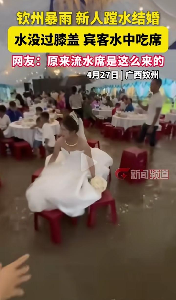 钦州这对新人这婚结得想忘都忘不了!4月27日广西钦州突降暴雨,这对新人直接蹚水办婚礼,积水都没过膝盖了,俩人挽着胳膊慢慢走,这氛围感比晴天还戳人! 现场宾客,没人因为大雨散场,反倒就着积水围坐吃席,水里干饭的样子又好笑又温馨,仪式感一点没打折扣,快乐压根没被暴雨冲淡~ 都说风雨同舟是婚姻最好的祝福,这对新人直接把这句话活成了现实!暴雨挡得住路,却挡不住满心的幸福,这独一份的婚礼回忆,真的刻进一辈子里了! 钦州暴雨新人蹚水结婚 暴雨中的浪漫