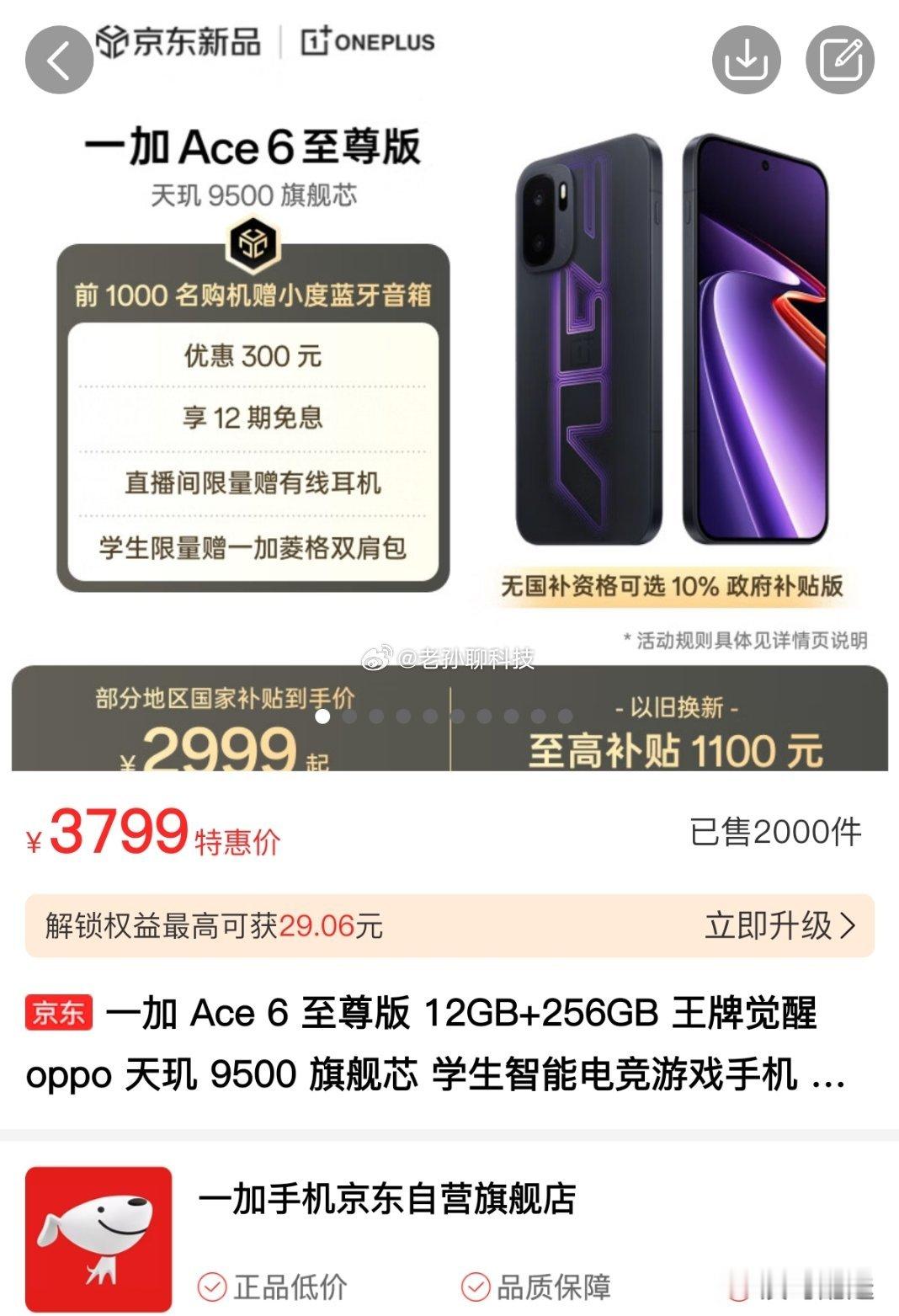 截至目前,一加Ace 6至尊版某东自营店销量已经突破2000多台