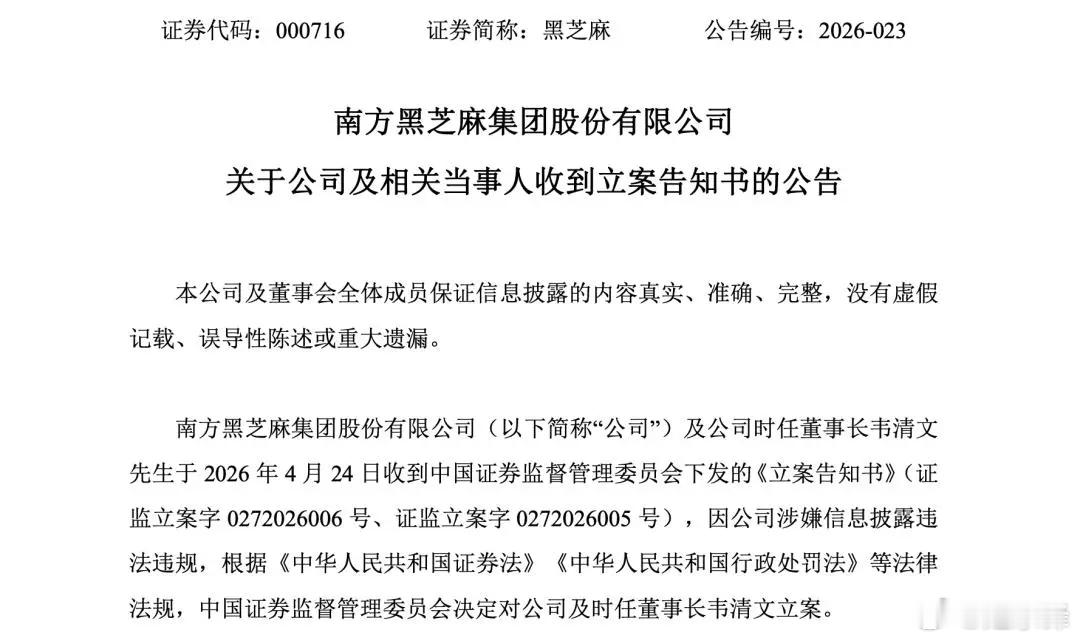 近日,南方黑芝麻集团股份有限公司(简称“黑芝麻”,000716.SZ)发布公告称,因公司涉嫌信息披露违法违规,中国证监会决定对公司及公司时任董事长韦清文立案调查。