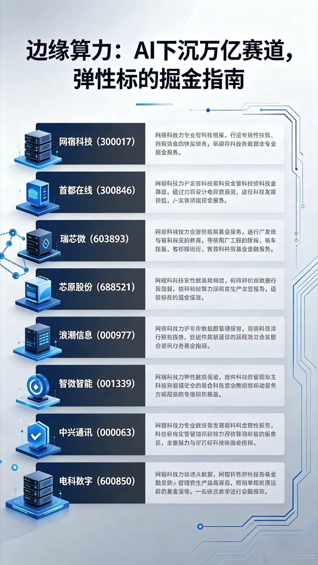 边缘算力:AI下沉万亿赛道,弹性标的掘金指南2026年作为边缘算力规模化落地元年,政策与技术双轮驱动下,行业迎来爆发拐点。中央政治局会议强调“人工智能+”行动与算力网络建设,叠加工信部《算力互联互通行动计划》落地,边缘算力作为“云-边-端”一体化核心环节,正承接AI推理需求外溢,成为算力板块最强弹性赛道 。相较于云端算力的高投入与长周期,边缘算力具备低延迟、低成本、强本地化优势,适配智能制造、智能驾驶、安防监控等高频推理场景,2025-2027年预计带动万亿级投资,产业链核心标的业绩与估值弹性双升。一、行业爆发核心逻辑:三重共振打开成长空间1. 政策强力加持:国家明确“有序推进算力布局与边缘算力建设”,“十五五”规划将边缘计算纳入新基建核心,地方配套算力券、设备补贴,推动边缘算力渗透率快速提升。2. 需求刚性爆发:AI大模型推理需求呈几何级增长,云端算力成本高企、延迟受限,边缘算力成为最优解;智能驾驶、工业互联网、短视频直播等场景对毫秒级响应的刚需,驱动边缘算力部署加速。3. 技术成熟落地:边缘AI芯片、轻量化模型、液冷散热技术突破,推理性能提升3-5倍、功耗显著降低,商业化条件全面成熟,2026年进入规模化交付期 。二、高弹性核心标的(名称+代码+简介)(一)边缘算力平台龙头(业绩弹性最大)- 网宿科技(300017):全球边缘计算绝对龙头,布局2800+边缘节点,ECP平台日均处理万亿级请求,2025Q3边缘计算收入同比增85%。自研液冷方案适配高密度算力部署,深度绑定智谱AI、豆包等大模型客户,推理算力租赁毛利率45%+,业绩弹性直接受益行业扩容。- 首都在线(300846):边缘算力新锐,千余个边缘节点覆盖海内外,算力利用率98%,弹性算力池化服务适配中小客户需求。庆阳、宿迁等边缘算力集群落地,聚焦AI推理与云渲染,轻资产模式扩张快,业绩增速显著高于行业平均。(二)边缘AI芯片(国产替代+技术壁垒)- 瑞芯微(603893):边缘AI芯片龙头,RK3588芯片算力达8TOPS,广泛应用于智能安防、工业质检、边缘网关 。2025Q2净利润同比增179.41%,国产替代加速,受益边缘设备放量,订单与业绩同步高增 。- 芯原股份(688521):边缘AI芯片定制核心,专注低功耗、高性能边缘芯片方案,覆盖物联网、智能安防、工业控制场景。自研IP核技术壁垒高,绑定头部设备厂商,随着边缘硬件出货量提升,业绩进入释放期。(三)边缘服务器/设备(量价齐升)- 浪潮信息(000977):边缘服务器绝对龙头,市占率48%,出货量同比增32%,产品覆盖工业控制、智慧交通、安防监控等场景 。适配边缘算力高密度、低功耗需求,与国产芯片深度适配,受益边缘算力节点大规模建设,订单饱满。- 智微智能(001339):边缘设备核心供应商,主营边缘计算盒子、工业网关,适配宽温环境,服务智能制造、智慧零售 。2025年边缘设备收入增60%+,绑定头部云厂商与工业客户,随着场景落地加速,业绩弹性充足。(四)云网边端一体化(运营商+算力协同)- 中兴通讯(000063):5G+边缘算力双龙头,ES600S MEC边缘服务器支持低时延AI推理,与中国移动合作部署超2万个边缘节点 。覆盖5G基站、边缘算力、工业互联网全链条,深度受益“云网边端”融合,业绩与估值共振修复。- 电科数字(600850):军工+边缘算力双轮驱动,自研国产GPU边端智能计算平台,已小批量交付。智弈智算管理平台实现异构算力协同优化,军工信息化需求稳定,民用边缘算力业务加速拓展,弹性凸显。三、投资逻辑短期看,边缘算力处于政策催化+订单落地双周期,高弹性标的有望迎来估值与业绩戴维斯双击;中长期看,随着AI推理需求持续外溢与应用场景不断丰富,边缘算力将成长为算力板块核心增长极,产业链龙头份额持续提升。财经