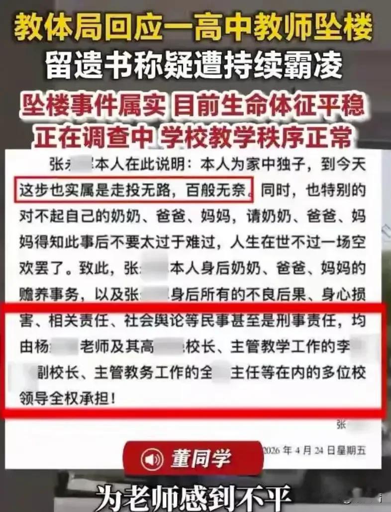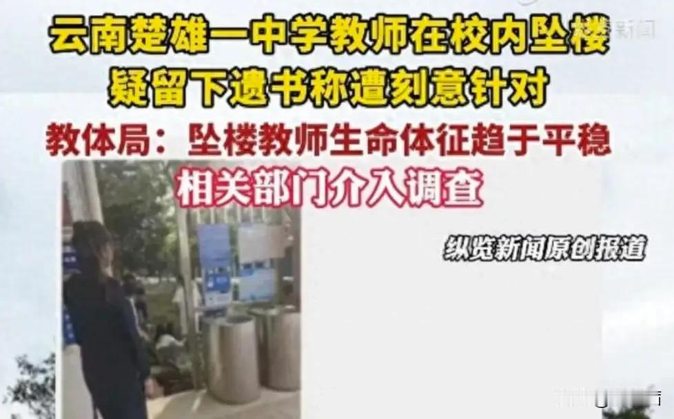 老实教师遭当众掌掴被逼跳楼,校园霸凌真相触目惊心 谁能想到,本该纯净的校园,竟会发生如此让人揪心的事!云南姚安一中老师跳楼事件,背后的霸凌恶行,看完让人怒火难平。 4月24日下午五点多,高三老师张某辉在教学关键期,从教学楼四楼跳下,所幸紧急抢救后脱离了生命危险。而他跳楼前留下的文字,彻底曝光了长期遭受的不公对待。只因按要求完成高二命题工作,他就遭到杨老师无端否定,不仅被当众严厉批评,还被踢出教研群、删除微信,饱受职场冷暴力。 更让人愤怒的是,杨老师曾当着全班学生的面,直接掌掴张老师,学生们当场集体抗议,却没能换来公平处理。随着事件发酵,更多人站出来发声,有学生爆料杨老师随意对同学进行人格攻击,还逼迫不合心意的学生退学,也有家长控诉遭其刻薄辱骂,种种行为完全丧失师德。 如今当地教体局、公安局已正式介入调查,网友们纷纷呼吁严查到底,绝不能让老实人受委屈,必须严惩霸凌者,还老师和学生一个清朗的校园环境。