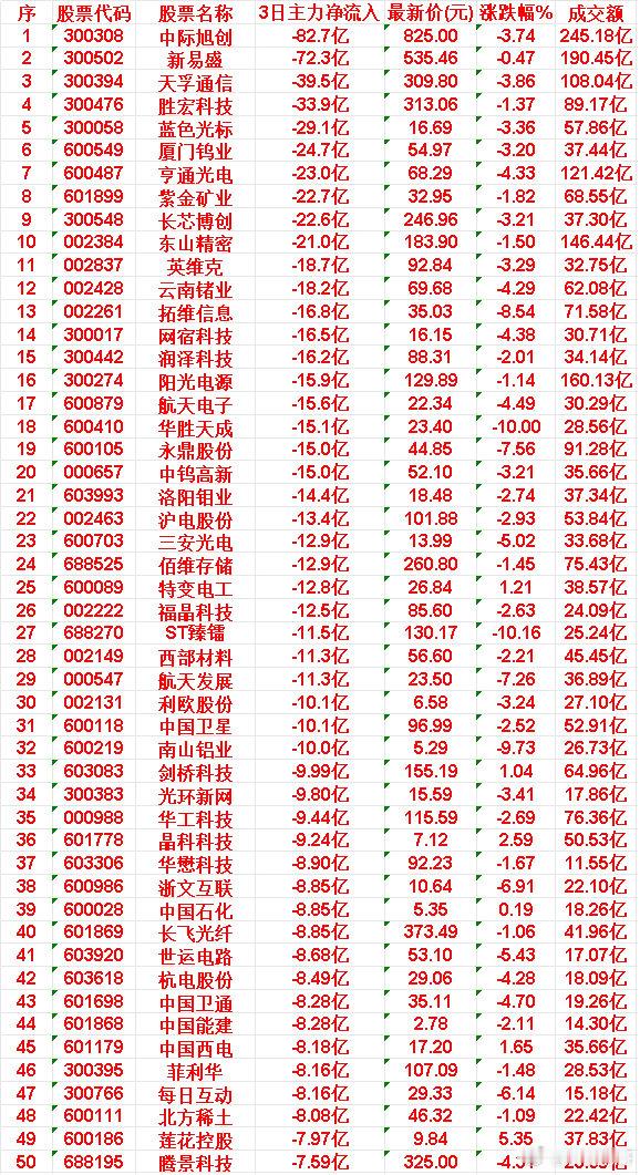 前3天主力大幅卖出前六名,中际旭创:3日净流入 -82.7 亿元,涨跌幅 -3.74%,成交额 245.18 亿元新易盛:3日净流入 -72.3 亿元,涨跌幅 -0.47%,成交额 190.45 亿元天孚通信:3日净流入 -39.5 亿元,涨跌幅 -3.86%,成交额 108.04 亿元胜宏科技:3日净流入 -33.9 亿元,涨跌幅 -1.37%,成交额 89.17 亿元蓝色光标:3日净流入 -29.1 亿元,涨跌幅 -3.36%,成交额 57.86 亿元厦门钨业:3日净流入 -24.7 亿元,涨跌幅 -3.20%,成交额 37.44 亿元