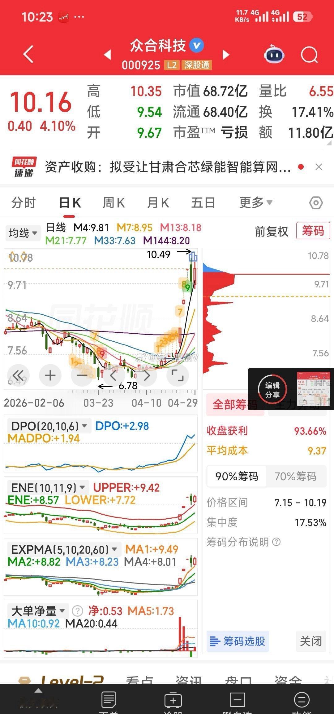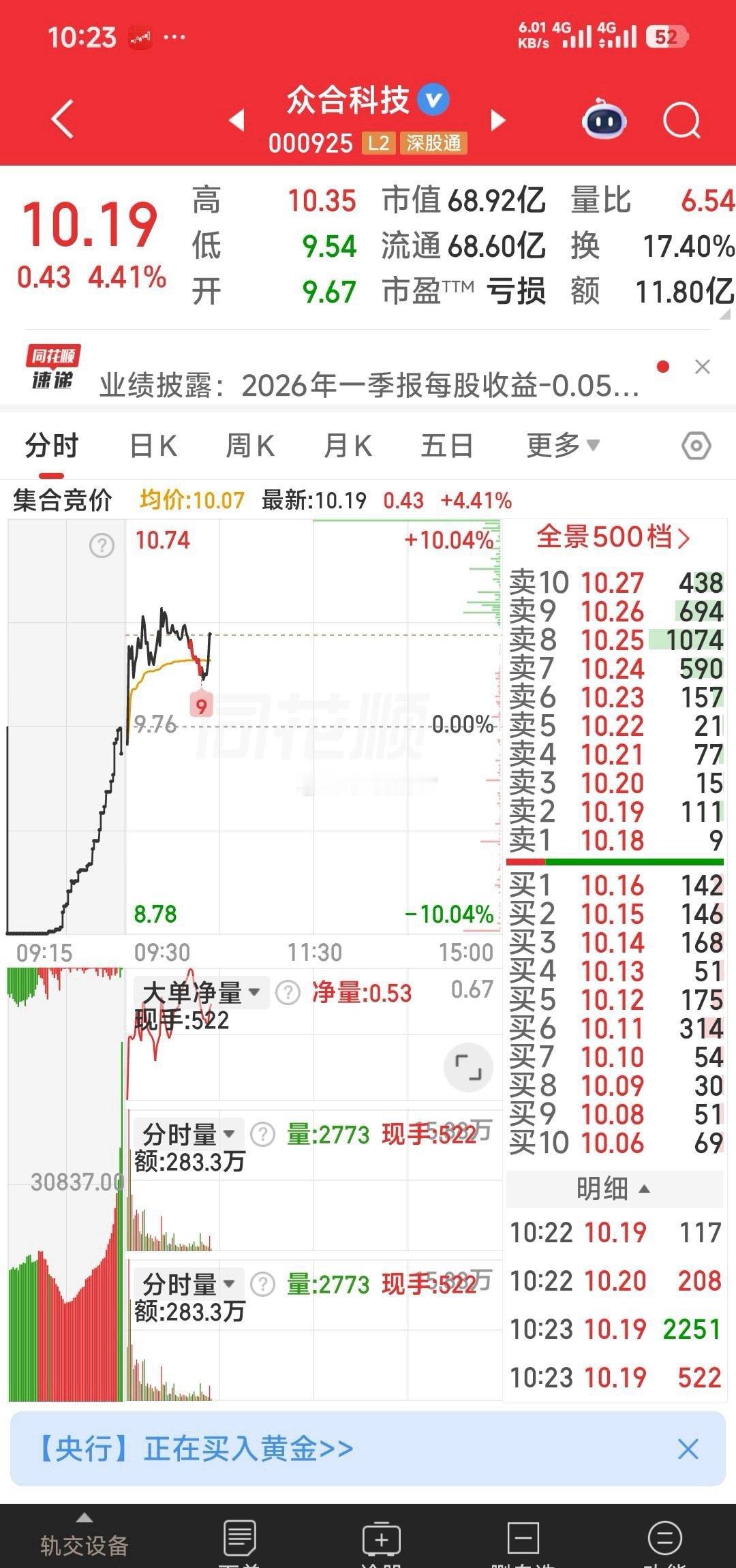 9.59元你昨天干了众合科技了没有?我说是洗盘,今天会继续向上呀