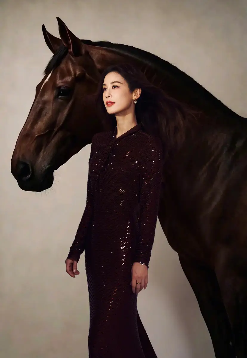 黄圣依一袭黑色连衣裙勾勒完美身材 与骏马同框冷艳高贵