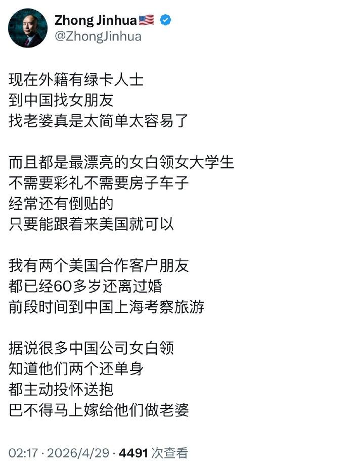 唉,这回让他说中痛处了,现在确实有不少这样的[抠鼻]。 嗯,崇洋媚外虽然不是民间主流,但在某些群体里确实是主流[摊手]。 不过,这样的走了好,走干净了最好。无所谓,只要是好这一口的,别就在这里就行了。 毕竟,只要是眼睛不瞎的都看得明白趋势——不说以后了,就算是现在都不知道有多少外女往这里跑的[加油]。
