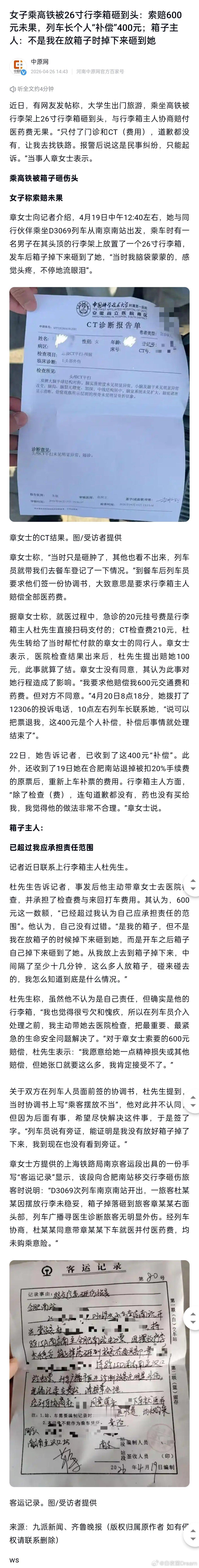 女子乘高铁被26寸行李箱砸到头:索赔600元未果,列车长个人“补偿”400元