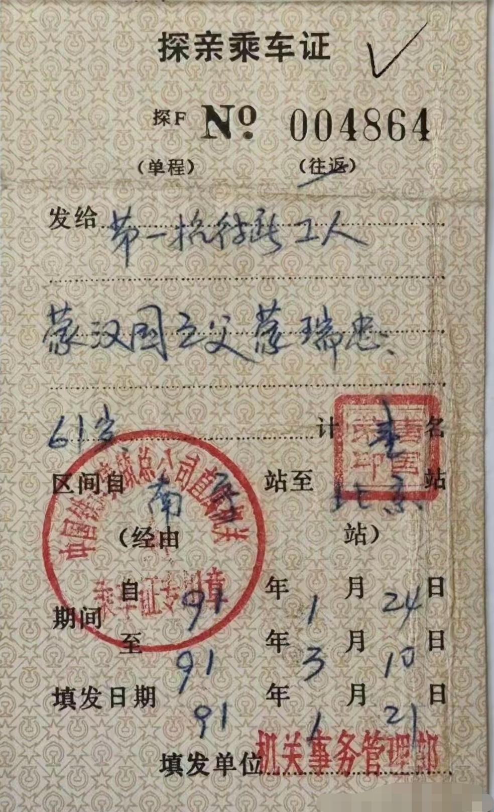 朋友们,快来看看这张老物件!我翻箱底找出一张1991年的铁路探亲乘车证,那纸张