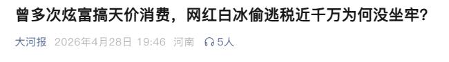 头部探店网红白冰,4年间偷逃税款近千万,豪车炫富、空壳公司避税,手法堪称网红圈“模板”,为何最终却能免于牢狱之灾? 4月28日,一则税务通报引爆全网,让无数网友炸开了锅——拥有4048.8万抖音粉丝的头部探店网红白冰,被国家税务总局公开通报偷税漏税,涉案金额高达911.18万元。 消息一出,没有多少人惊讶于他的违法事实,反而有一个问题冲上热搜榜首,成了全民热议的焦点:偷逃税款近千万,数额如此巨大,白冰为何没有被判刑坐牢? 这背后的真相,不仅揭开了网红圈偷税漏税的灰色面纱,更让所有人看清了法律的边界与底线。 可能还有不少人对於白冰并不陌生,这位1993年出生于吉林四平的网红,凭借探店视频迅速走红,截至通报发布时,他已发布727个作品,累计获赞6.1亿,是妥妥的头部探店博主。 不同于其他低调的网红,白冰的视频里满是炫富的痕迹,兰博基尼、法拉利等百万级跑车是他探店的“标配”,3888元一碗的面、帝王蟹、数百万元的烟花秀更是家常便饭,高调的消费方式曾多次引发网友争议。 谁也没想到,这位看似光鲜亮丽、日进斗金的网红,背后却在疯狂偷逃税款,用违法手段积累财富。 随着央视独家调查的深入,白冰偷税的完整作案链条被彻底曝光,其手法之“熟练”,堪称网红圈违法避税的“教科书”,但每一步操作都触碰着法律的红线。 为了逃避高额税费,白冰动起了歪心思,核心就是将本应缴纳高额个税的个人劳务所得,伪装成税率更低的经营所得。 为了实现这一目的,他直接或间接持股的公司多达十余家,更在重庆注册了一家个体工商户,长期进行大额申报,营造出经营红火的假象。 可稽查人员实地调查后发现,这家所谓的个体工商户,大门紧锁,没有任何实际生产经营迹象,也没有一名参保人员,就是一个彻头彻尾的空壳公司,唯一的作用就是帮白冰偷逃税款。 白冰这种利用空壳公司、虚假申报偷逃税款的行为,看似‘高明’,实则是对国家税收制度的漠视,更是在挑战法律的权威,这种行为不仅造成国家税款流失,也破坏了公平的市场秩序。 很多网友疑惑,偷逃税款近千万,早已远超法律规定的“数额较大”标准,白冰为何能免于牢狱之灾? 根据《刑法》第二百零一条规定,逃税罪的构成需要同时满足两个条件:逃税数额较大(10万元以上)且占应纳税额10%以上,白冰的偷逃金额远超10万元,理论上已经触及了刑事红线,本该被追究刑事责任。 但法律也给初犯者留下了一次改过自新的机会,只要在税务机关依法下达追缴通知后,足额补缴税款、缴纳滞纳金并接受行政处罚,就可以不予追究刑事责任。 白冰之所以能避免坐牢,正是因为他全额缴纳了1891.24万元,其中包括追缴的税款、滞纳金和罚款,加上他是首次出现税务违法,全程配合执法工作,才符合了免予刑事处罚的法定条件。 不过需要明确的是,这种“初犯免责”并不是偷税漏税的“护身符”,更不是高收入群体的“避风港”。 律师特别提醒,这一免责机会只有一次,如果五年内因逃税受过刑事处罚,或者被税务机关给予两次以上行政处罚,再次被查出偷税漏税,将直接刑事立案,再也没有补税免责的机会。 白冰的案例,看似是法律的柔性执法,彰显了法理与人情的结合,但绝对不是对偷税行为的纵容,“法律给予初犯者补救的机会,是为了引导其知错改错,而不是让某些人抱有侥幸心理,认为只要事后补税就可以肆无忌惮地违法,这种想法无疑是自欺欺人。” 事实上,白冰偷税案件的曝光,也暴露了高收入网红群体偷税漏税的行业乱象。 近年来,随着网红经济的快速发展,越来越多的网红凭借高额收入成为高风险纳税人群,但部分人却心存侥幸,试图通过各种违法手段偷逃税款。 对此,税务部门早已加大监管力度,持续聚焦股权转让、文娱直播等领域的高风险个人,数据显示,2024年全国税务系统共检查此类高风险个人4223名,查补收入71亿元,用实际行动彰显了打击涉税违法行为的决心。 作为拥有数千万粉丝的公众人物,白冰本应以身作则,严守税法底线,为粉丝和社会树立良好的榜样,可他却利用自身影响力和资源,大肆偷逃税款,这种行为不仅损害了国家利益,也辜负了粉丝的信任。 白冰的案例,给所有高收入群体尤其是网红群体敲响了警钟:依法纳税是每个公民不可逾越的法定义务,无论收入高低、职业类别,都必须自觉遵守税法规定,主动履行纳税义务。 所谓的“避税技巧”,大多是违法操作,一时的侥幸或许能获得短暂的利益,但最终必将受到法律的制裁。 信息来源: 大河报 2026年4月28日 《曾多次炫富搞天价消费,网红白冰偷逃税近千万为何没坐牢?》