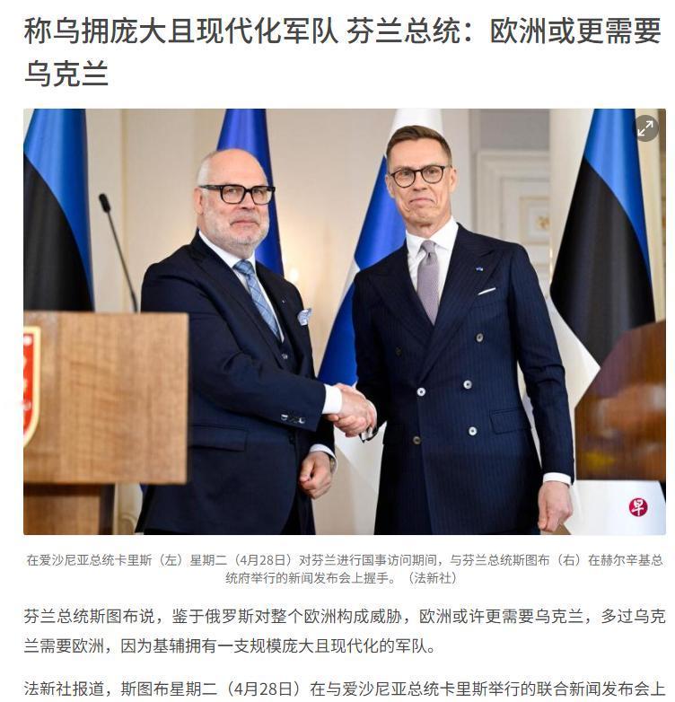 欧洲彻底慌了!芬兰总统直言:欧洲更需要乌克兰,而非反之!4 月 28 日,法新社报道,芬兰总统斯图布在与爱沙尼亚总统卡里斯的联合新闻发布会上表示,鉴于俄罗斯对欧洲的威胁,比起乌克兰需要欧洲,欧洲或许更依赖乌克兰——因为基辅拥有欧洲规模最大、效率最高且最现代化的军队,他还称过去四个月乌克兰局势已转向有利方向。 这话听着有点颠覆认知,毕竟一直以来,都是欧洲在给乌克兰送援助、喊口号,可细琢磨就会发现,斯图布说的全是大实话,尤其是那句“基辅拥有欧洲规模最大、效率最高且最现代化的军队”,更是一针见血点出了欧洲的软肋。 先说说乌克兰的军队,这可不是斯图布随口吹捧。俄乌冲突爆发后,乌克兰军队经历了实战的千锤百炼,早已不是战前那支规模有限的队伍。 泽连斯基政府早已启动军队结构全面改革,将原本以旅为最大单位的编制,升级组建多达20个军级单位,每个军级单位至少包含5个旅,专门负责特定作战领域,像战斗力强悍的第三突击旅、亚速旅都被升级为军团,这种调整让乌军的大规模作战能力大幅提升。 更关键的是,乌军的效率和现代化程度,在欧洲范围内确实难逢对手。过去四个月,这种优势体现得淋漓尽致。 4月下旬,俄西部边境五州在24小时内遭遇多波次乌军无人机集群袭击,别尔哥罗德州、布良斯克州等多地防空系统紧急拦截,仅4月以来,俄西部五州拦截的乌军无人机数量就比3月激增217%。 这些无人机不仅数量多,精度还极高,乌克兰与挪威刚签署的无人机联合生产项目,首批中程攻击无人机在赫尔松地区测试时,精准摧毁俄军3辆T-90M坦克,实时传输精度达到0.3米,能直接引导“海马斯”火箭炮打击俄军指挥所。 更值得一提的是,乌军还摸索出了高效的消耗战术,将西方导弹技术改装后用于无人机,单架无人机成本从2024年的5万美元压缩至8000美元,用低成本装备持续消耗俄军实力,这种实战中练出的效率,是欧洲那些养尊处优的军队比不了的。 反观欧洲各国,号称军工强国的德国,至今现役士兵只有18万,即便喊出要扩军至26万现役、总兵力46万的目标,可连训练和住宿的基础设施都跟不上,更别说实战经验了,所谓“打造欧洲最强大常规军队”,目前还停留在采购装备、制定计划的阶段。 斯图布说过去四个月乌克兰局势已转向有利方向,也有实打实的依据。 最明显的就是乌克兰军工体系的韧性,俄罗斯曾试图通过打击乌克兰能源设施和军工工厂,切断其装备供应,可西方迅速提供了数百台小型发电站,欧盟委员会单独就移交了447台应急发电机,G7+集团更是承诺提供超过6000台能源设备。 这种分布式能源供应,让乌克兰即便损失了约一半战前发电能力,无人机组装工厂仍能正常运转,甚至在短短几个月内将无人机产量提高数倍,还把部分生产转移到欧洲,让俄军的打击失去意义。 欧洲对乌克兰的依赖,本质上是自身实力不足的无奈。 这些年欧洲多数国家产业空心化,军工体系持续萎缩,要么依赖美国的军事保护,要么自身装备研发停滞不前。 德国酝酿新建旅级战斗队,计划采购1000辆“豹”-2主战坦克和2500辆“拳击手”轮式装甲车,可这些装备的生产和列装还需要时间,短期内根本形成不了有效战力。 其他欧洲国家更不用说,要么兵力不足,要么战备松懈,真要直面俄罗斯的威胁,恐怕连自保都成问题。 乌克兰就不一样了,经过两年多的实战,军队不仅规模庞大、经验丰富,还能快速适应战场变化,加上西方的深度支持,从单向接收援助转向联合研发生产,挪威甚至开始反向采购乌制武器装备,这让乌克兰成为欧洲抵御俄罗斯威胁的“前沿屏障”。 欧洲看似在援助乌克兰,实则是靠乌克兰挡在前面,替自己承受来自俄罗斯的军事压力,要是没有乌克兰这支能打硬仗的军队,欧洲各国恐怕早就慌了神,更别说维持当前的安全局势。 斯图布作为芬兰总统,比其他欧洲国家更清楚这种依赖的重要性。 芬兰紧邻俄罗斯,对俄罗斯的安全威胁有着最直接的感受,也更明白一支强大且能实战的军队,对欧洲安全有多重要。 欧洲各国嘴上喊着支持乌克兰,心里其实很清楚,自己离不开乌克兰的“守护”,这种依赖,与其说是主动选择,不如说是欧洲自身军事短板下的必然结果,毕竟比起乌克兰需要欧洲的援助,欧洲更需要乌克兰替自己守住安全的大门。