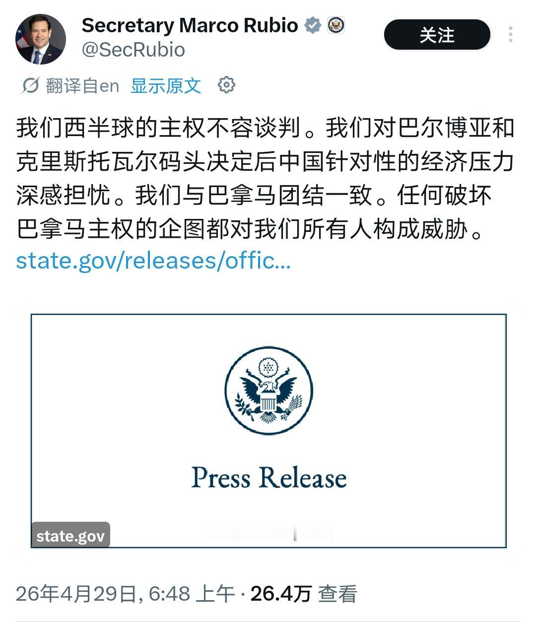鲁比奥表达不爽,但美国又能怎样? 鲁比奥一句「半球主权不容谈判」,真是开了天眼 —— 头回见把霸权主义包装得这么直白!可美国的不爽,在我们步步合规的打法面前,再横又能怎样? 中国企业拿下巴拿马码头运营权,走的是公开招标、合法签约的完整流程,受当地法律保护。反倒是 2025 年 2 月,鲁比奥约见穆里诺当面要挟,逼他对两港口开刀,没想过今天会搬起石头砸自己的脚? 美国拿不出像样的替代项目,给不了拉美真正需要的发展机会,只能靠抹黑施压刷存在感。而穆里诺手里明明握着运河杠杆,却把好牌无偿送了美国,连回报都不敢要,这份 “慷慨”,如今看来,委内瑞拉的德罗西才是他的 2.0 版本。 说到底,他们都是被美国「门罗主义」洗脑的牺牲品,以为投靠霸权就能自保,实则是自废武功;而鲁比奥除了跳脚骂街,还能怎样呢? Source: X