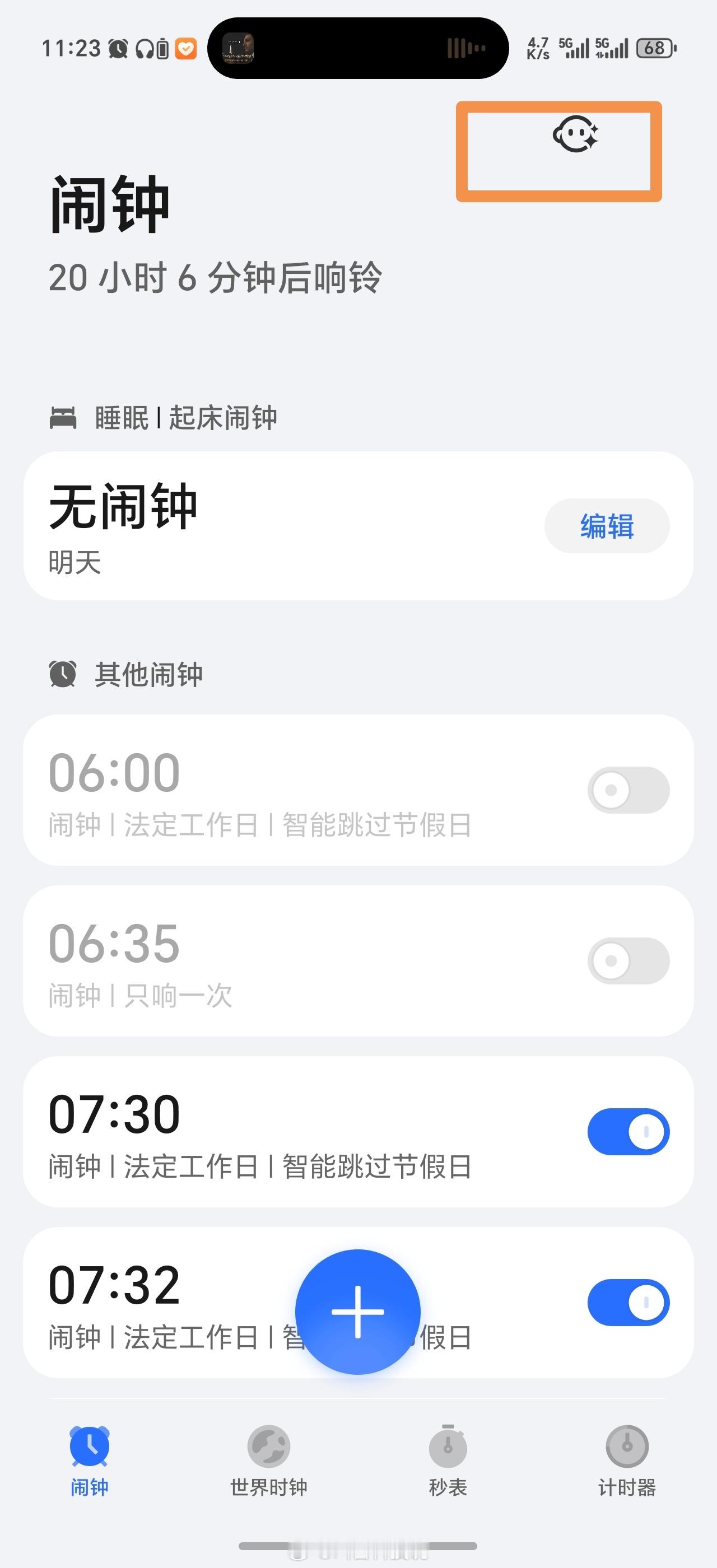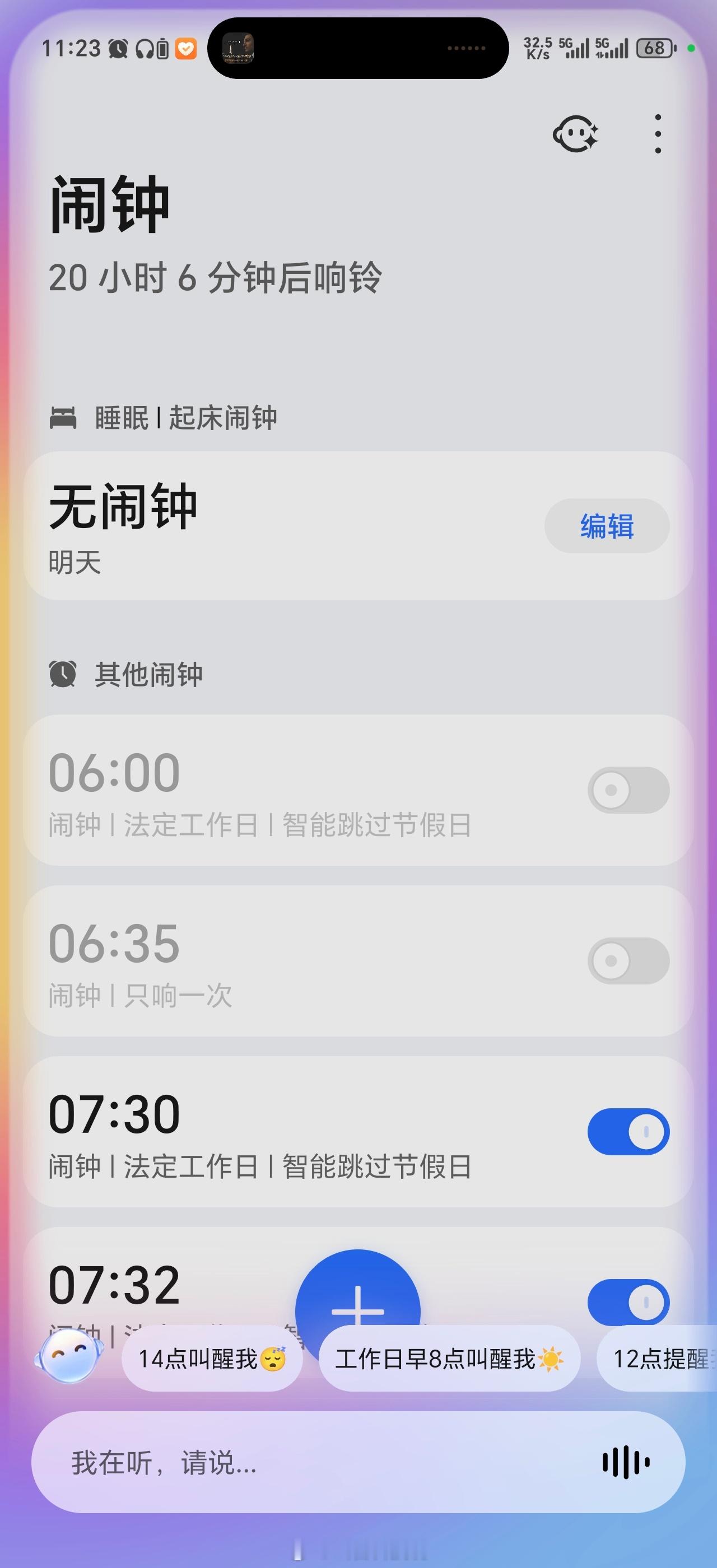 突然发现在闹钟界面上,荣耀也继承了AI助手。点击右上角的AI助手,就可以通过语音实现对闹钟的一些操作。