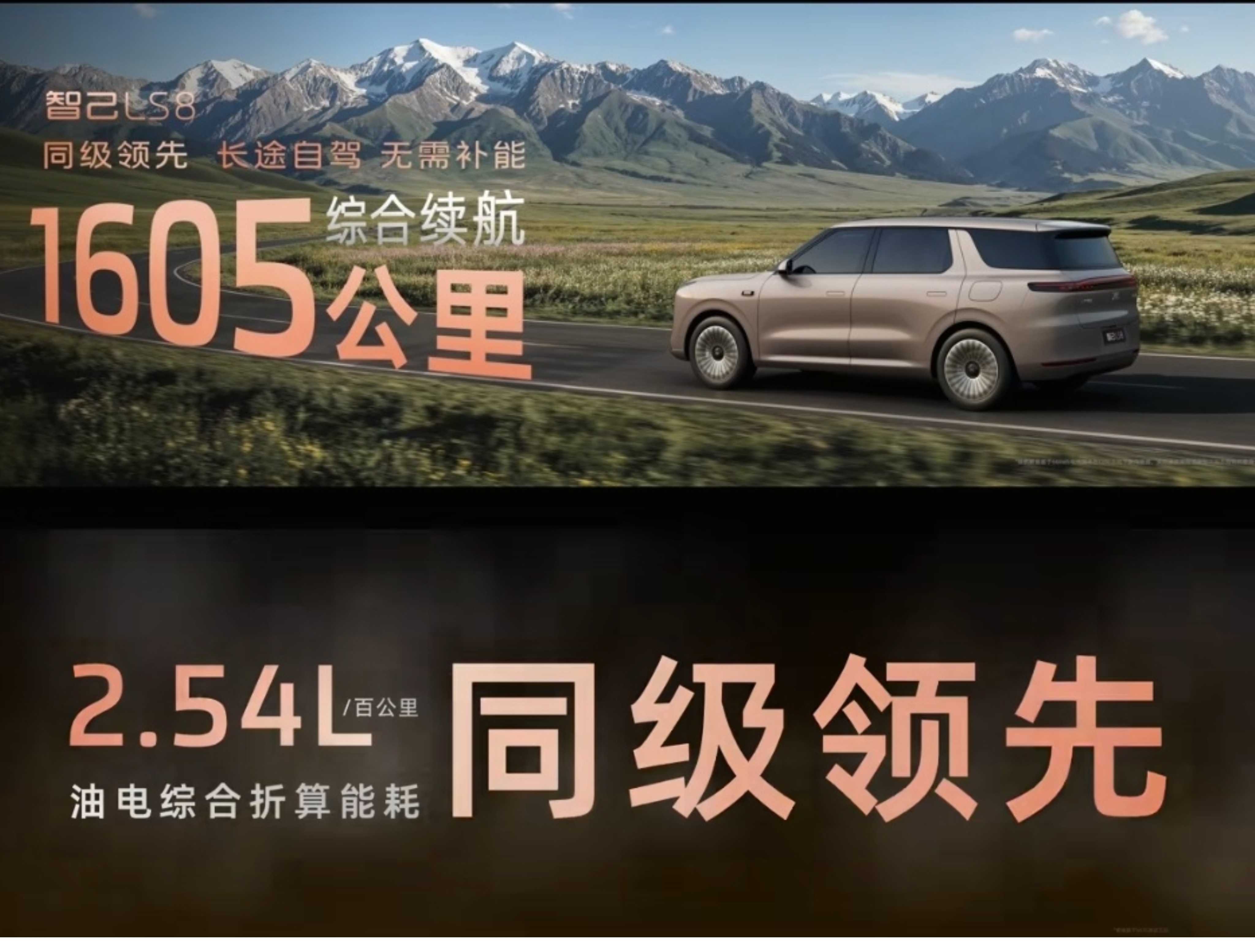 ● 同级领先1605公里综合续航能力、430公里增程纯电续航、2.54L/百公里油电综合折算能耗。