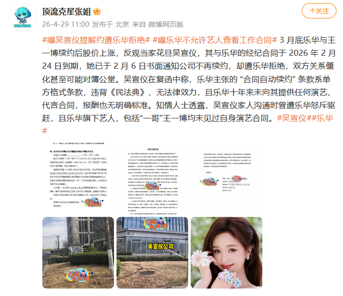 吴宣仪母亲被赶出公司曝吴宣仪提解约遭乐华拒绝 曝吴宣仪提解约遭乐华拒绝,吴宣仪家人沟通时曾遭乐华怒斥驱赶,且乐华旗下艺人,包括王一博均未见过自身演艺合同。