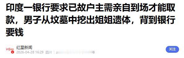 印度,一50岁男子家住偏远部落,姐姐因病去世后留下1400元存款,为取出这笔钱,他多次往返银行,却被要求户主亲自到场。走投无路之下,他竟亲手从坟墓中挖出姐姐骸骨,扛到银行门口证明姐姐离世... 在印度奥里萨邦的偏远部落,一场令人揪心的荒诞事件,打破了乡村的宁静,也刺痛了无数人的神经。 事发当天,50岁的吉图·蒙达扛着一个包裹,神情激动地站在当地银行门口,嘴里不停诉说着自己的委屈,周围很快围满了围观的群众,当有人看清包裹里的东西时,所有人都惊呆了——那竟是他已经去世两个月的姐姐的骸骨。 没人能想到,一个普通的村民,会做出如此极端的举动。 吉图来自迪亚纳利村,是个不识字的普通人,文化程度有限,连基本的办事流程都不懂,常年生活在信息闭塞的偏远地区,日子过得十分清贫。 他的姐姐今年56岁,两个月前因病去世,是吉图在这个世界上唯一的亲人,姐姐离世后,只留下了一个银行账户,里面存着约1.9到2万卢比,换算成人民币大概1400元。 对很多人来说,1400元或许只是一顿饭、一件衣服的开销,甚至不值一提,但对吉图来说,这笔钱就是他接下来几个月的生活费,是姐姐留给她最后的念想,也是他维持基本生活的唯一希望。 起初,吉图以为这件事很简单,只要他去银行,说明姐姐已经去世,自己是她唯一的亲人,就能顺利取出这笔钱。 可现实给了他沉重一击。 吉图第一次走进银行,说明自己的来意后,银行工作人员却给出了一个冰冷又教条的要求:必须由户主本人到场,或者法定继承人持完整的死亡证明、继承文件等相关材料,才能办理取款手续。 这个要求,对吉图来说,无疑是一道无法跨越的鸿沟。 他居住在偏远部落,交通不便,信息闭塞,本身又不识字,根本不知道去哪里办理死亡证明和继承文件,更无力独自准备这些繁琐的材料。 但为了取出这笔钱,吉图没有放弃,他一次次往返于银行和村子之间,反复向工作人员说明姐姐已经去世,自己是她唯一的亲人,可每次得到的,都是同样冰冷的拒绝,工作人员要么敷衍了事,要么固执地强调“按规定办事”,完全无视他的困境。 一次次的碰壁,一次次的绝望,慢慢压垮了这个朴实的村民。 他听不懂银行那些复杂的规定,也不知道该找谁求助,他只知道,姐姐已经不在了,这笔钱是姐姐留给她的,他只是想拿回属于自己的东西,却比登天还难。 在无尽的绝望和愤怒之下,吉图做出了一个让所有人都震惊的决定。 他来到姐姐的墓地,亲手掘出了姐姐的骸骨,小心翼翼地装入包裹,然后扛着这个沉重的包裹,一步步走到了银行。 他要用这种最原始、最极端的方式,向银行证明:他的姐姐,真的已经去世了;他,真的只是想拿回属于自己的钱。 银行门口,吉图的举动引发了轩然大波。 围观的群众中,有人感到震惊,有人发出叹息,还有人心疼地为他向银行工作人员解释情况,大家看着这个满脸憔悴、神情激动的男人,心里满是心酸。 有人拿出手机,拍下了这荒诞又令人揪心的一幕,视频上传到网络后,很快在印度社会引发了广泛讨论,越来越多的人开始关注这件事,指责银行的冷漠与僵化。 吉图的遭遇,让人既心疼又愤怒,他的极端行为固然不妥,不该打扰逝者的安息,违背了法律和情感的底线,但这背后,是弱势群体走投无路的绝望,是基层公共服务与普通人之间的巨大鸿沟。 吉图不识字、信息闭塞、身处偏远地区,繁琐的手续和僵化的办事流程,对他而言,比贫困本身更令人无助。 银行作为服务机构,在执行规则的同时,本该多一份同理心,多一份人性化,多为弱势群体考虑,主动协调解决问题,而不是一味地甩出“按规定办事”的冰冷话语,将一个走投无路的人,逼到绝境。 这场因1400元引发的荒诞闹剧,终会慢慢平息,吉图也终将拿到属于自己的钱,但它留下的思考,却从未停止。 在这个时代,规则的刚性固然重要,但人性化的温度,更不可或缺。 希望所有的服务机构,都能引以为戒,打破僵化的流程,多倾听普通人的声音,多关注弱势群体的困境,让规则不再冰冷,让每一个人都能感受到应有的尊重与温暖。 信息来源: 红星新闻 2026年4月28日 《印度一银行要求已故户主需亲自到场才能取款,男子从坟墓中挖出姐姐遗体,背到银行要钱》