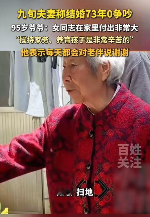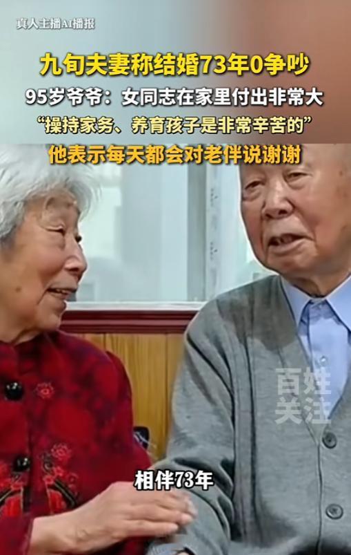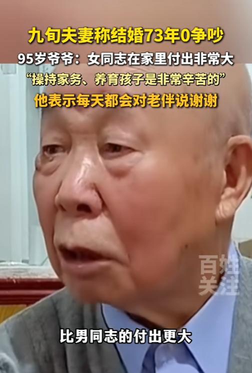 “这是真爱!”4月27日报道,河南郑州,一对夫妻相伴73年,他们从没吵过架,别人询问恩爱秘诀是什么,爷爷说凡事都要好好商量、并打心底里认可老伴操持家务和养育子女的辛苦,一辈子都记得她的付出!网友:细水长流的爱情更动人! 73年,0次争吵。 当这两组数字摆在一起,任何人都会愣住——这不是数学题,而是河南郑州一对九旬老人用一生写下的婚姻答卷。95岁的龚爷爷至今紧握着90岁申奶奶的手,就像73年前第一次牵起她那样自然。 2026年4月27日,一段采访视频让他们再次走进公众视野。网友曾言:“细水长流的爱情更动人。”深思之,有对夫妻着实刷新大众对婚姻的认知。他们携手走过73载婚姻岁月,竟从未有过红脸争执,令人动容。 显然不是。爷爷自己都说了,“哪有牙齿不碰舌头的”。他们的秘诀不是什么高深的心理学理论,而是四个字——好好说话。 爷爷讲起一件小事:家里但凡有点事,他从不自己拍板,非得拉着老伴坐下聊聊。你说你的想法,我听我的意见,有分歧也不急眼,慢慢磨出一个两全其美的法子。 乍听之下,此事似轻而易举,然而真正付诸实践,方知其中艰难险阻横亘,绝非想象中那般易如反掌。 有多少人,会将“分歧”误判为“对抗信号”呢?这看似简单的认知偏差,实则反映出人际交往中理解与包容的缺失。一开口就是“你怎么总是这样”,话越说越难听,最后赢了嘴仗,把心吵散了。爷爷呢?他的逻辑链条很清晰——老婆为这个家付出太多,我看见了,所以我尊重她。尊重了,还有什么好吵的? 此逻辑,精准地击中了众多人的痛点,宛如一把锐利的匕首,在人们的心灵深处划出一道深深的伤痕,引发了广泛的共鸣与反思。 年轻人在评论区感慨:现在的人结婚快,离得也快。有点小事就针尖对麦芒,动不动闹离婚。众人皆忘却一事,婚姻之底色,乃包容也。于婚姻里,需心怀对方,以包容相携,如此,方能让爱长久,婚姻美满。 这话不假。但问题的根源还在更深的地方。 爷爷有句话特别戳人:“没啥是应该的。” 这话是对奶奶说的。奶奶每次忙完家务,他都会道一声“谢谢”。奶奶总说“应该的,瞎客气啥”,可爷爷每次都坚持:你为家付出这么多,我说谢谢是天经地义。 多少夫妻的矛盾,根源不在于吵不吵架,而在于“看不见”。看不见对方的疲惫,看不见家务的繁重,看不见那些没人瞧见的付出。而后,轻飘飘地抛出一句“你在家又不累”,如柔软却锋利的刀锋,于无声无息间,刺痛人心,伤人无形。 爷爷心里跟明镜似的。他年少时便在外辗转奔波,家中大小事务皆由奶奶一人独力承担。洗衣做饭不辞辛劳,照料老人无微不至,抚育孩子费尽心血,尽显坚韧与担当。自始至终,我皆未让他为我忧心分毫。无论生活琐事抑或人生抉择,我都妥善处理,未曾使他因我而烦忧。 他记着这份苦,念着这份好,所以每天都要说一声“谢谢”。 乍听之下,此般行事似是老派作风,然而深究其中,实则蕴含着顶级情商的智慧,于传统中彰显着为人处世的精妙之道。 一句“谢谢”,对奶奶来说意味着什么?这意味着她的付出终于映入他人眼帘,得到了应有的承认,更收获了他人的尊重。这份认可,如暖阳般温暖着她的内心。她说这辈子不图大富大贵,也不要啥惊喜,就大爷这一句话,干啥都值了。 这就是正向循环。爷爷说谢谢,奶奶笑了,爷爷看着奶奶笑,继续说谢谢。刹那之间,数十年恍若白驹过隙,匆匆飞逝。轻启唇舌,回首处,沧海桑田已然变迁。几十年韶光,就在这片语之间,悄然滑过。 有多少夫妻困在“理所应当”的陷阱里?一方觉得“我上班这么累,回家还要做家务”,另一方觉得“我在家也不轻松”。谁也不让谁,谁也看不见谁。随着时光的悄然流逝,倦怠之感与日俱增。到后来,竟连开口说句话都觉是件劳神之事,能省则省了。 爷爷的“保鲜大法”,本质上就是两个字——看见。 看见对方的付出,然后说出来。无需惊天动地之举,亦无需浪漫的烛光晚餐。只需一句轻柔的“辛苦了”,便足以慰藉疲惫的心灵,让一切付出都变得值得。 当然,73年的婚姻,不可能只有甜蜜。他们大概率也遇到过经济困难、子女教育、老人赡养这些坎。但他们没有让这些事成为夫妻之间的墙,而是用商量和尊重,把每一个坎都迈过去了。 这才是“钻石婚”的真正含义。 并非历经煎熬而得,实则凭借洞察与认知辨认而出。它不是在漫长的熬磨中浮现,而是于明晰的识辨里呈现。每一次说谢谢,都是一次确认:你的付出,我看见了。 申奶奶这辈子的婚姻哲学很简单:不图大富大贵,不要浪漫惊喜,就要一个能看见她、心疼她、记着她好的人。 龚爷爷做到了。 文章发出后,评论区很热闹。有人说“找个懂你疼你的另一半,真是几辈子修来的福气”。有人说“希望两位老人家一直这么好下去,没病没灾”。 (信息来源:百姓关注《九旬夫妻称结婚73年0争吵!95岁爷爷分享恩爱秘诀:凡事好好说话,每天都会对老伴说谢谢。》)