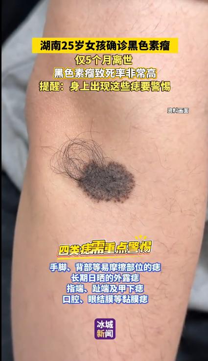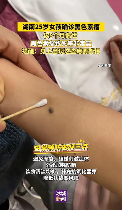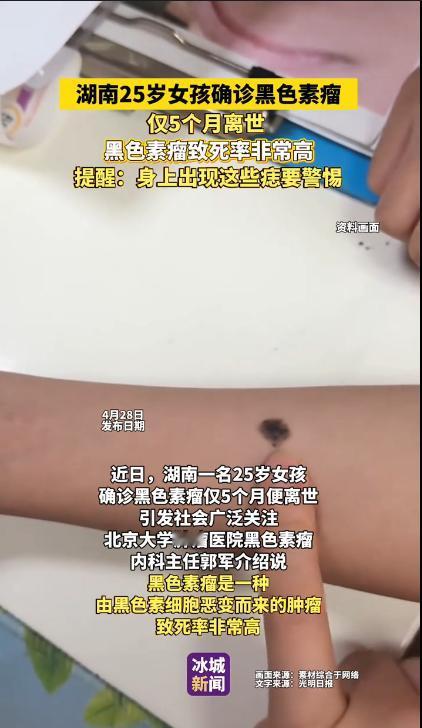 25岁女孩还没等到订婚,就因为身上的黑痣走了,从确诊到离开只有5个月……而身上长有这种黑痣的人,不在少数。医生提醒:身上的痣发生变化一定要警惕! 据4月26日新闻报道,湖南25 岁姑娘 “克拉姐姐” ,原本今年就要和男友订婚,去年 11 月说腹部长了个巨大肿瘤,结果确诊黑色素瘤,短短 5 个月就没了命。 别觉得这事儿很远,黑色素瘤这玩意儿被医生称为 “癌中之王”,恶性程度高得吓人,一旦转移,半年左右就可能要命。 咱身上谁还没几颗痣啊?我自己胳膊上、脸上就好几颗,以前从来没当回事儿,觉得就是个小点点,现在想想真是后脊背发凉! 这玩意儿平时看着老实,要是突然作妖,那就是要命的节奏! 我国黑色素瘤发病率虽然不算高,但这几年一直在上升,关键是晚期死亡率极高,看着就渗人! 最让人惋惜的是,这姑娘要是早点发现就好了!早期黑色素瘤经外科切除术后,还是有很大治愈可能的,可一旦到了晚期,神仙难救,这前后差距简直是天壤之别,想想就替她不值! 你肯定要问了,怎么判断自己的痣有没有问题?医生总结了个 ABCDE 法则,记好了能救命!A 是不对称,普通痣两边对称,恶性的两边长得不一样,歪歪扭扭的。 B 是边缘不规则,良性痣边缘光滑清晰,恶性的就跟锯齿似的,还模糊不清,甚至有 “伪足” 往周围皮肤伸,看着就膈应人,这种一看就不是好东西! C 是颜色改变,普通痣一般就一种颜色,恶性的可花了,黑的、褐的、蓝的、粉的混在一起,还可能突然加深或褪色,跟调色盘似的,看着就不正常! D 是直径,普通痣一般小于 5 毫米,恶性的通常超过 6 毫米,跟个小硬币似的,要是你身上有这么大的痣,赶紧去医院看看,别拖着! E 是隆起和变化,普通痣一般不隆起,恶性的会轻微鼓起来,还可能痒、痛、出血、结痂,甚至破溃,这些都是危险信号,千万别不当回事! 很多人觉得身上的痣从小就有,没什么大不了,就算有点变化也懒得管,总觉得癌症离自己远,这种侥幸心理真是要不得!这姑娘就是活生生的例子啊! 还有些人更离谱,觉得痣影响美观,就自己在家用针挑、用醋泡,甚至去路边小店点痣,这简直是在作死!反复刺激痣会大大增加癌变风险,这些行为千万不能做! 亚洲人黑色素瘤有自己的特点,50% 长在肢端,比如足底、足趾、手指末端和甲下,还有些隐蔽部位,这些地方的痣更要格外注意! 还有些人觉得年轻人不会得癌症,这纯属瞎扯!年轻人身体再好也不能掉以轻心! 平时洗澡、换衣服的时候,就该多留意自己身上的痣,尤其是易摩擦部位,比如腰带处、手掌、足底这些地方,摩擦会增加癌变风险,要是发现有变化,别犹豫,赶紧去皮肤科检查! 别觉得去医院麻烦,做个皮肤镜检查又快又准,花不了几个钱,却能排除大隐患,比起治疗癌症的费用和痛苦,这简直太值了!千万别等到疼了、肿了才去,那时候可能就晚了! 有些人怕去医院,怕查出不好的结果,可逃避解决不了问题!早发现、早诊断、早治疗,这是对付癌症的黄金法则,这姑娘要是早点发现腹部的异常,说不定现在都订婚了,多好的年纪啊! 还有那些总说 “我身体好得很,不用检查” 的人,身体好不是你忽视健康的理由!多少年轻人就是仗着年轻,熬夜、吃垃圾食品、不运动,最后把身体搞垮了,后悔都来不及! 这姑娘原本有美好的未来,有疼她的男友,有幸福的家庭,就因为一颗不起眼的痣,一切都没了,这得多让人痛心啊!她的家人、男友得多难过,这可是一辈子的遗憾! 健康这东西,没了就真没了,多少钱都买不回来! 更别迷信那些 “点痣能祛灾” 的说法,那都是骗人的!痣就是痣,要么良性要么恶性,跟命运没关系,与其相信这些,不如相信科学,相信医生,这才是对自己负责! 平时出门也要记得防晒,紫外线照射也是黑色素瘤的诱因之一,别觉得晒黑了好看,皮肤癌可不是闹着玩的,涂防晒霜、戴帽子、穿防晒衣,这些小事都能帮你远离风险! (每天更新,欢迎关注,喜欢文章的可以帮忙点个赞留条评~) 对此大家有什么看法?