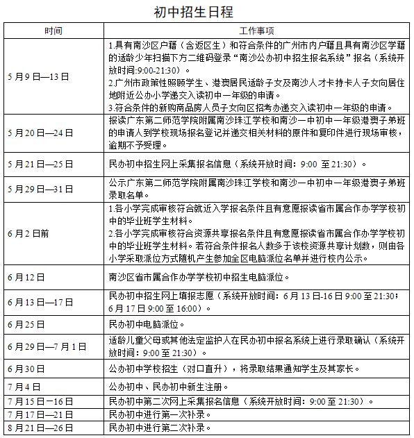 【南沙初中招生日程公布!】南沙中小学招生日程公布!可以看到今年开始初中报名也要在统一的系统进行报名了,不是跟之前一样在学校填表了。 公办初中5月9日就可以开始登录系统进行报名了,6月12日进行合作办学学校初中招生电脑派位。6月30日是对口直升学校公布录取结果。 另外各大小学的学校招生计划、招生地段也正式公布。具体可以看图,不解读。有疑问的可以后台私信问小编。