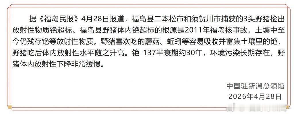 日本福岛县野猪检出放射性物质铯超标