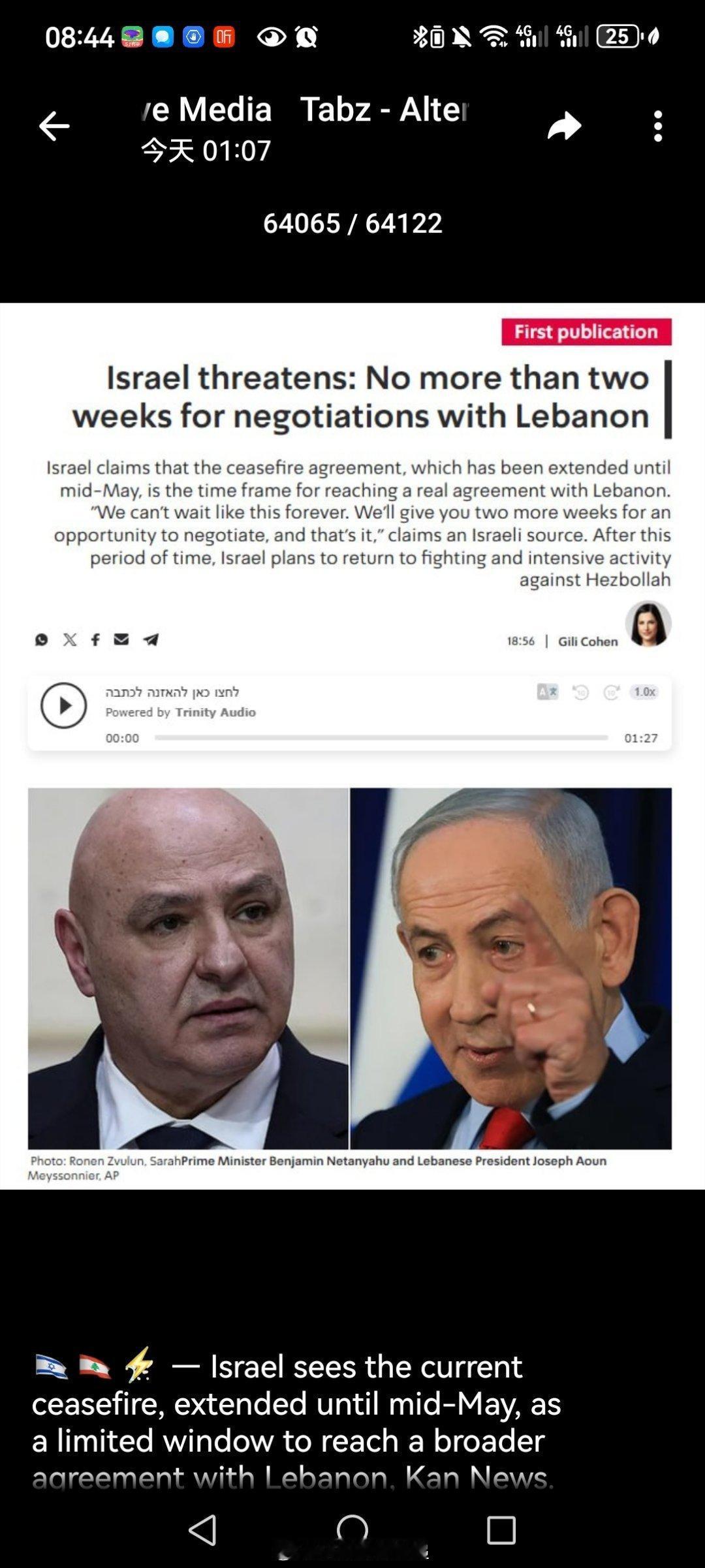 据Kan新闻报道️,以色列将目前延长至5月中旬的停火视为与黎巴嫩达成更广泛协议的有限机会。 如果在停火期间未能达成协议,以色列计划恢复对黎巴嫩真主党的军事行动。特朗普政府正试图安排以色列总理内塔尼亚胡与黎巴嫩总统约瑟夫·奥恩会面,但双方官员都对此次会面能否实现持怀疑态度。 一位以色列消息人士对Kan表示:“我们不能永远这样等下去。我们会再给你们两周时间进行谈判,之后就到此为止了。 以色列军方称,昨天以军的一辆“工程车辆”(破坏性挖掘机/推土机)在黎巴嫩南部边境的艾塔龙村遭到“真主党”的FPV无人机袭击,导致一名“平民军事承包商”(阿拉伯裔以色列人)死亡,其儿子受重伤。