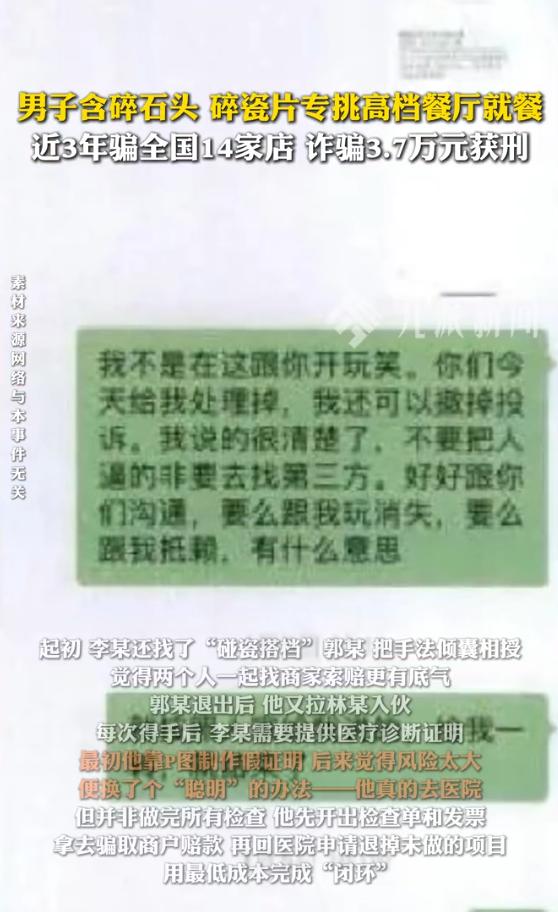 2026年4月28日,新民晚报一篇报道撕开了职业索赔人李某的真面目,一张医生签名“撞脸”的诊断书,让横跨北京、上海、深圳的“苦肉计”彻底穿帮。 俗话说,“贪小便宜吃大亏”,这话放在李某身上再贴切不过。 故事的起点其实挺普通,2023年年初,他在一家饭店吃饭,真咬到了小石头,牙龈出血。 商家怕影响生意,痛快赔了笔钱。 这本是再正常不过的消费纠纷,可李某却像捡到了“致富密码”。 原来“吃饭出事”这么容易换钱? 从那以后,李某彻底变了个人。 他不再老老实实吃饭,而是琢磨起“套路”。 直接要钱太露骨,得让商家觉得“理亏”。 他的目标专挑某平台上生意好、装修上档次的餐厅。 这类店不差钱,更怕差评。 李某后来坦言,小城市的店他根本看不上,“赔不出几个钱”。 动手前,他把小石头或碎瓷片提前含在嘴里,或者上厕所时偷偷塞进去。 巧的是他有蛀牙,轻轻一挤就出血,配合“异物”简直天衣无缝。 等“吃完饭”,他捂着嘴喊疼,说要去检查,商家怕闹大,往往顺着他的意。 起初他还拉了个搭档郭某,两人一起“碰瓷”,手法倾囊相授。 郭某退出后,他又找了林某入伙。 每次索赔都需要医疗证明,李某最初用P图造假,后来觉得风险太大,竟想出个“聪明”办法。 真的去医院挂号开检查单,但不做项目,拿着发票找商家赔钱后,再回医院退掉未做的检查,用最低成本完成“闭环”。 几年间,他的足迹遍布一二线城市。 直到2025年底在深圳某餐饮店故技重施,商家说要走保险理赔。 李某当场慌了! 他在全国用这招出险太多次,怕保险公司查出来。 可越怕什么越来什么,保险调查员复核材料时,发现不同医院的诊断书上,医生签名居然是同一个人! 再一查,申请理赔的全是餐饮店,这哪是巧合? 公安机关介入后,保险公司调取全国数据,结果令人咋舌。 2023年1月至2025年底,李某单独或伙同他人,用“吃出小石子/瓷片”的理由,从14家饭店骗得3.7万余元。 他钻了商铺间不共享数据的空子,以为能瞒天过海,却栽在一张签名“撞脸”的诊断书上。 2026年4月16日,宝山区检察院以诈骗罪提起公诉。 法院审理认为,李某以非法占有为目的,虚构事实隐瞒真相,多次骗取钱款,数额较大,犯罪事实清楚。 4月28日,判决落地,有期徒刑一年三个月,罚金一万五千元。 检察官的话值得所有商家和消费者警醒,“碰瓷”不是谋生之道,法律更不是儿戏。 餐厅遇到顾客索赔时,别因怕麻烦私下和解,要留存现场证据,走正规保险渠道。 消费者更要守住诚信底线,靠骗来的钱,迟早要加倍还回去。 回头看李某的“生意经”,从偶然获赔到精心设计,从单干到团伙作案,每一步都在试探法律和道德的边界。 可惜他忘了,再完美的骗局,也逃不过细节的漏洞。 一张签名相同的诊断书,就像照妖镜,让他现了原形。 这场持续近三年的闹剧,最终以铁窗泪收场,留给我们的,是对诚信与贪婪最真实的注解。 主要信源:(手机光明网——他含着石头、碎瓷片去吃饭,让全国14家饭店“出血”,还教“徒弟...)