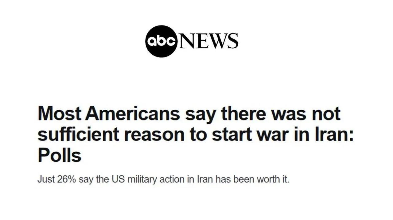 美国广播公司(ABC)报道称,多数美国人认为对伊朗发动战争不合理。根据调查数据,63%的受访者认为攻击伊朗缺乏充分的正当理由,只有26%的人认为美国攻击伊朗是合理的。 这种调查结果,如果没有今年的中期选举,对懂王的决策是不会产生影响的。但是美国今年有中期选举,这个调查结果就对懂王的决策有很大影响了。也就是懂王如果还要继续打伊朗的话,中期选举共和党就彻底没有胜的可能了。