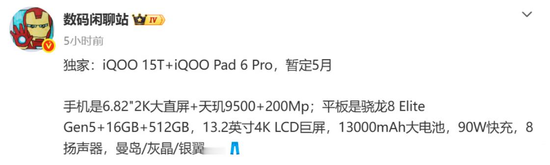 iQOO15T配置信息:6.82英寸直屏、天玑9500、2亿像素主摄;
