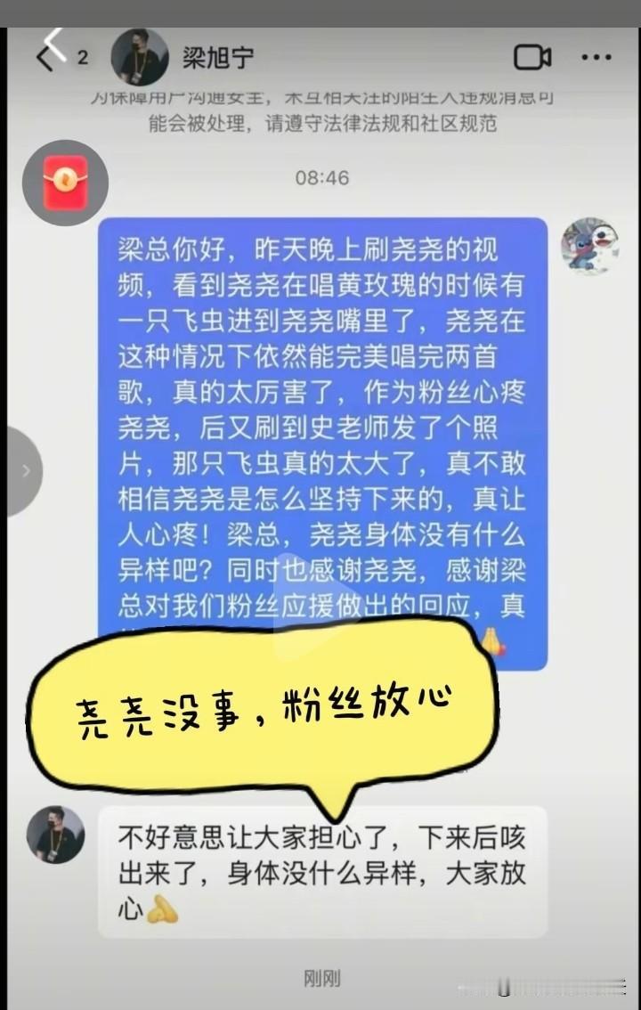 飞进徐子尧嘴里的那只飞虫被尧尧咳出来了!小姑娘真是勇敢呀!为了把最美的一面留给舞台和观众,尧尧硬是生吞了那只飞蛾。 尧尧公司的梁总终于回应了大家的关心,好在尧尧身体没什么异样,大家放心吧! 经过这次的波折,相信尧尧会越来越强大的!