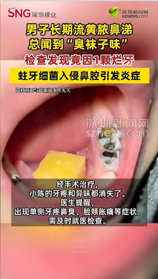 “小毛病也不要拖!”4月28日报道,浙江杭州,一男子老是流黄浓鼻涕,鼻子里还一股臭袜子味。他去到医院检查,结果却发现不是鼻子的问题,而是一颗蛀牙烂透了,发展成了牙源性上颌窦炎!网友:早治一点事儿也没有! 千里之堤溃于蚁穴,很多大问题,最开始都只是个不起眼的小毛病,早点解决掉,一点事儿都没有。拖着拖着,就变严重了,还可能诱发其他问题。 据媒体报道,陈先生年纪不大,才30岁,很久之前,他嘴里就有颗蛀牙,但他觉得也不是什么大事儿,就一直没去治疗。最近一段时间,他鼻子一直不舒服,老是流黄浓鼻涕,还闻到一股臭袜子味。 他以为就是普通的鼻炎,刚开始也没在意。可渐渐地,症状始终不见好转,治鼻炎的药也没什么疗效,他这才去了医院检查。检查发现,陈先生的病根儿不在鼻子上,而在那颗蛀牙上。 原来,由于陈先生一直不治疗,任由蛀牙发展,整颗牙都已经烂透了。细菌通过烂牙突破了骨板,钻进了上颌窦,最终导致他患上了牙源性上颌窦炎。 查出病因后,治疗倒是简单了,做了个手术,陈先生的不适症状就消失了,恢复了健康。 网友看后表示,现在就数着口腔赚钱,一堆人牙齿有问题的,动不动就是洗牙拔牙根管治疗,年轻人尤甚。像他这样牙不好还不治的,还真不常见。这回也算是给长了个记性,以后再有小毛病,可抓紧去给治了! 信息来源:《男子因蛀牙未治长期流黄脓鼻涕闻到“臭袜子味”】 蛀牙细菌入侵鼻腔引发炎症》深圳新闻网