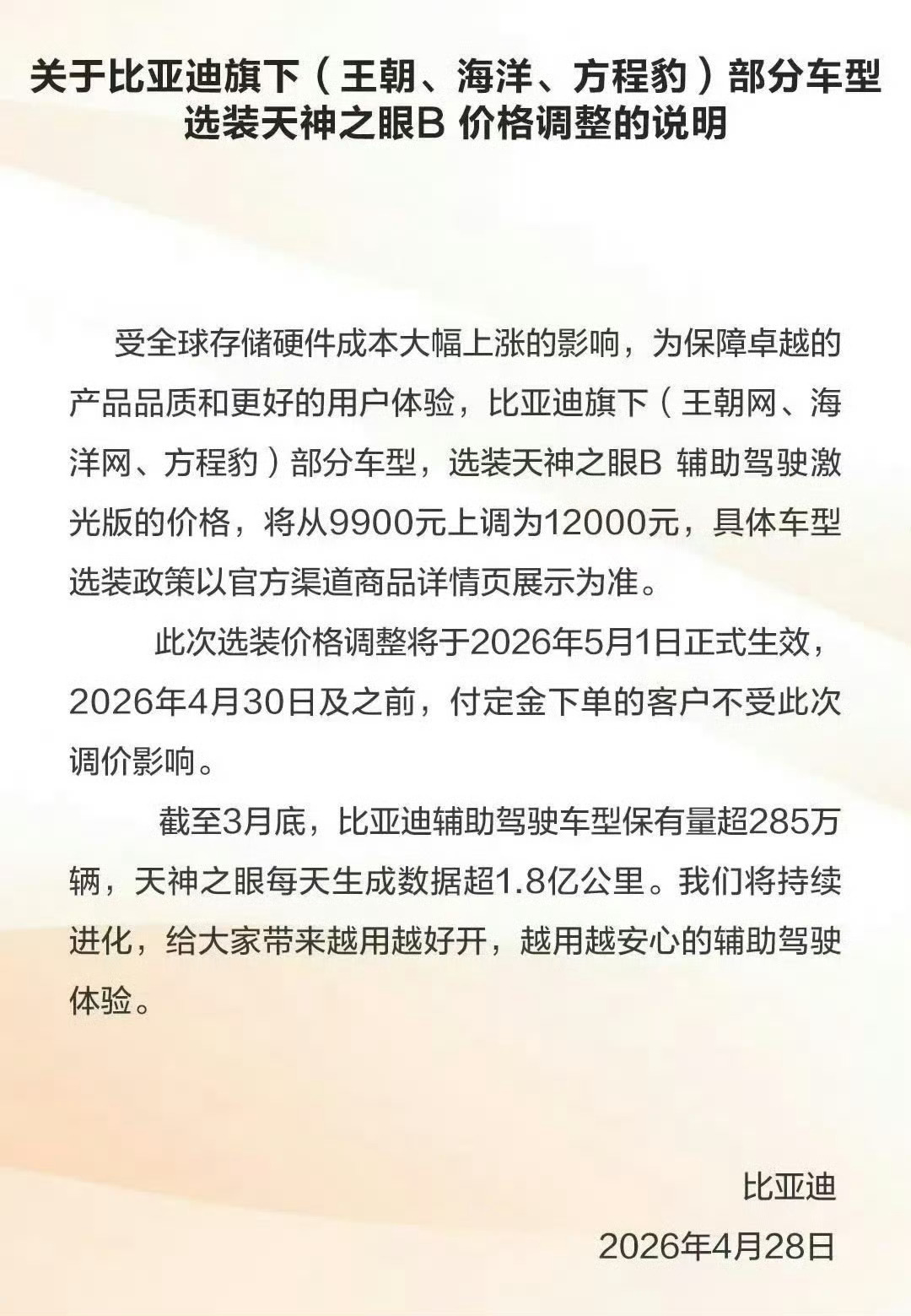 所以你会看到一个变化:车价不动,但智驾开始加钱了比亚迪宣布涨价比亚迪宣布涨价
