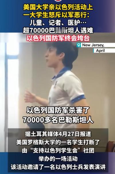 以色列士兵原本是被请进罗格斯大学演讲的,可真正完成“演讲”的,反而是当场站起来质问他的学生。 美当地时间4月27日,美国罗格斯大学邀请以军士兵进校园演讲。可问题是,加沙还在流血,医院还在废墟里,孩子还在饥饿和炮火中死去,这种时候把以军士兵请上讲台,是交流,还是洗白? 这个学生当场怒斥以军在加沙的所作所为:儿童、记者、医护人员,都成了炮火下的牺牲品,超过7万名巴勒斯坦人遇难。更有冲击力的是,他本人还是犹太裔,他提到自己祖母曾经历大屠杀,然后说出一句很重的话:“Never again”不该只属于犹太人,而应该属于所有人。 这句话为什么扎心?因为它直接撕开了以色列最常用的叙事外衣。过去他们总说自己是在“自卫”,可自卫能炸医院吗?能让儿童一批批死去吗?能让记者、医生、护士都变成名单上的数字吗? 加沙的惨状早就不是一句“冲突”能糊弄过去的。数据显示,已有大量儿童死于炮火和相关冲突,数千名孩子被迫截肢,上千名医护人员遇难,很多医院停摆,饥荒和流离失所正在吞噬普通人。 需要说清楚,加沙卫生部门公布的死亡人数中,也包含少量哈马斯误射、内部冲突等因素,并非百分百都由以军直接造成,但谁都无法否认,以军行动是最主要的灾难来源。 有人说,学生打断演讲不礼貌。可我倒想问一句:当屠杀被包装成分享,当苦难被轻描淡写成背景板,沉默就礼貌了吗?如果连大学讲堂都只剩下强权叙事,那学生的质问,反而成了现场最清醒的声音。 当然,现场并不是所有人都站在同一边,有挺以的,也有挺巴的,场外还有声援巴勒斯坦的抗议。那名学生随后被保安带离,以军士兵也并没有被骂到彻底沉默,后面仍继续完成了分享和问答。 但这场反转已经说明一件事:以色列想靠演讲粉饰战争,越来越难了。因为加沙的废墟不会说谎,死去的孩子不会消失,世界上的良知也不会永远装睡。 罗格斯大学这一幕,不只是一次校园争议,更像是一记响亮的提醒:暴行可以被包装一时,但终究会被历史清算。正义也许走得慢,但它从来不会真正缺席。