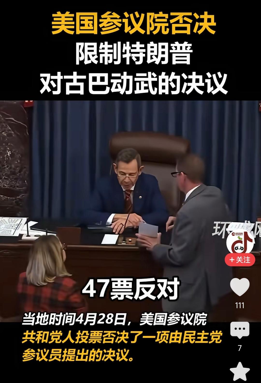 当地时间4月28日,美国民主党参议员提出了一项决议,试图给特朗普套上战争的“紧箍咒”,禁止他未经国会授权对古巴动武。可这项为和平设下的最后一道防线,却被共和党议员以47票反对的结果,彻底给否决了! 美国宪法里写得很清楚,宣战权只属于国会。但这次投票,直接把这道红线给破了。共和党为了保住特朗普,连最基本的战争风险都弃之不顾。甚至佛罗里达州的共和党参议员斯科特还轻描淡写地说:“美国和古巴又没开战,搞这种限制根本没必要。” 可问题是,恰恰是因为还没开战,才更要防着有人会乱来。别忘了,特朗普是个不按常理出牌的人。他在任时就已经撕毁了奥巴马时期对古巴的缓和政策,并对古巴实施了史上最严厉的制裁。 现在国会又把战争权直接放开,等于是递给他一把可以随时扣动扳机的枪,而且,今后已没有任何法律再能拦住他扣动扳机。 现在的特朗普,手握“无授权开战”的权力,国会的制衡彻底失效。他可以为了选举造势、为了转移矛盾,甚至为了一句冲动的推特,就能随时把战火引向古巴。 更讽刺的是,美国总喜欢打着“民主自由”的旗号,干着践踏规则、为战争松绑的勾当。所谓的“和平承诺”,在党派利益面前脆得像张纸。 这一票否决,否决的不只是一项限制动武的决议,更是美国国会对总统战争权的最后一道约束。也就是说,从此刻起,古巴的安全不再取决于国际法,也不再取决于美国的制度,而是只取决于特朗普的心情……